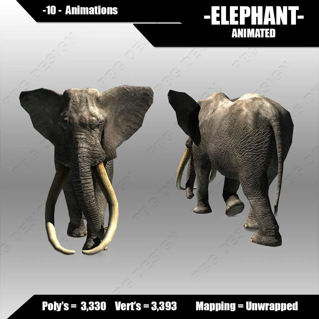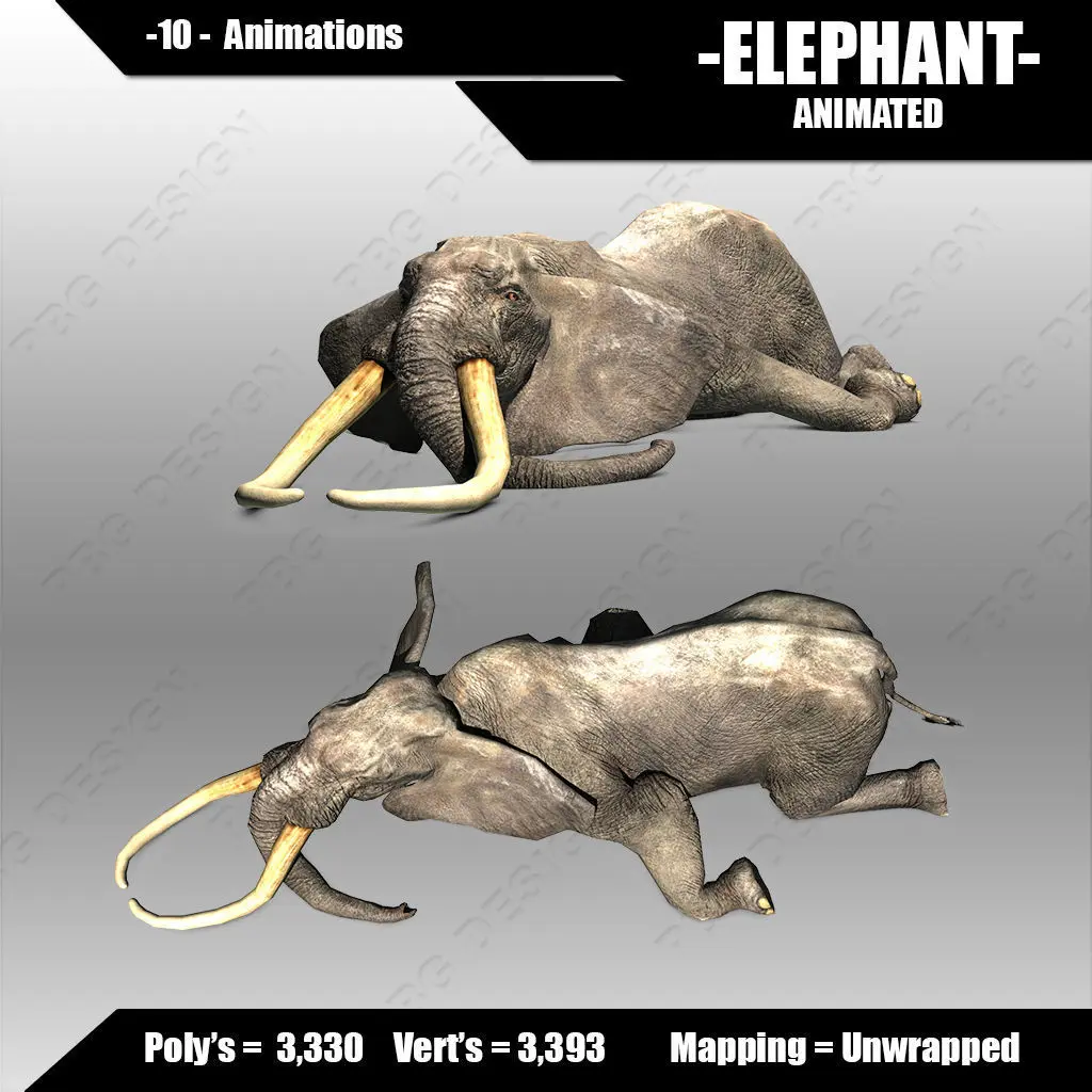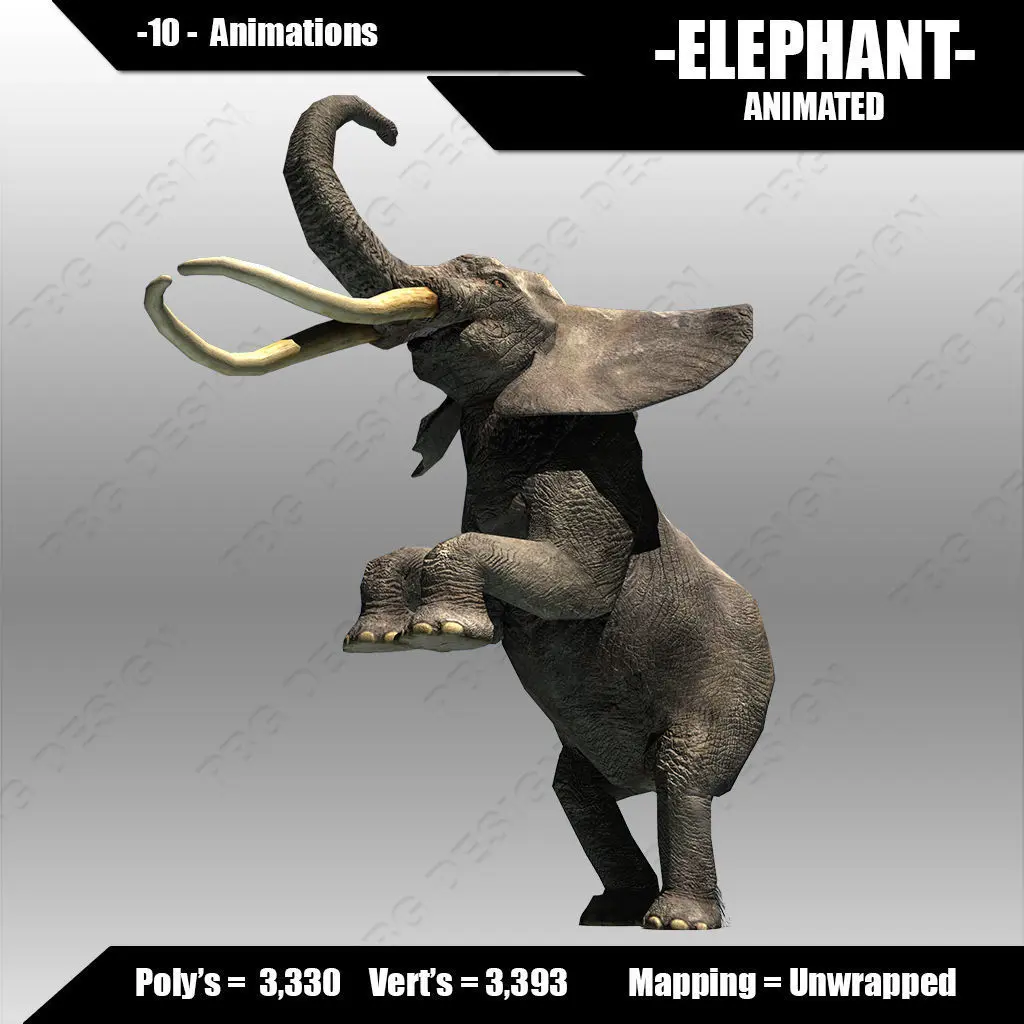 A model of a Elephant fully rigged and animated. Comes with 10 animations.