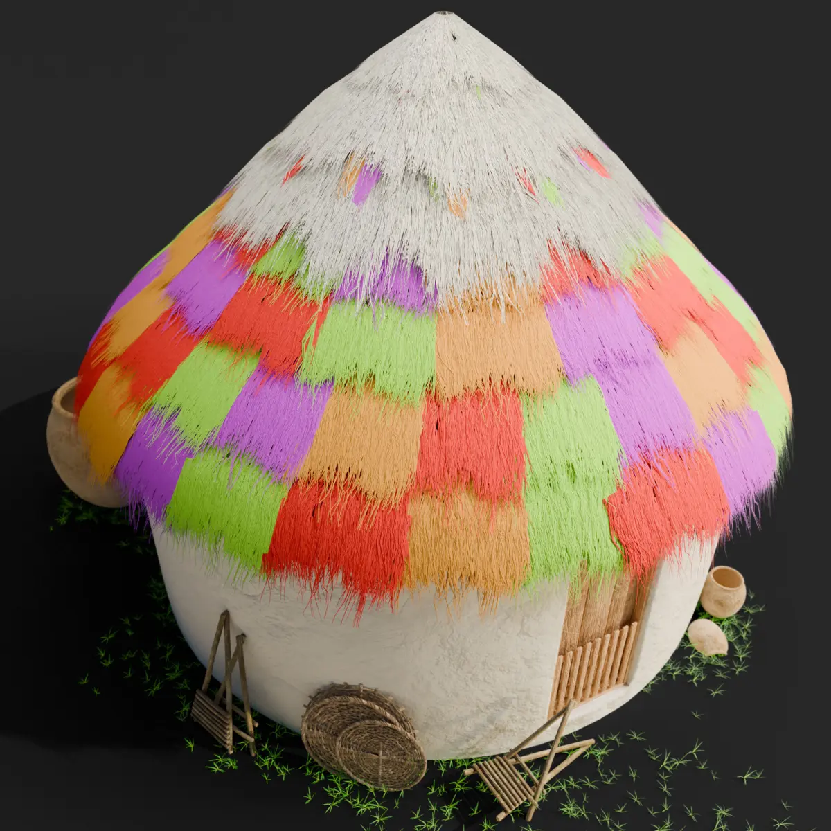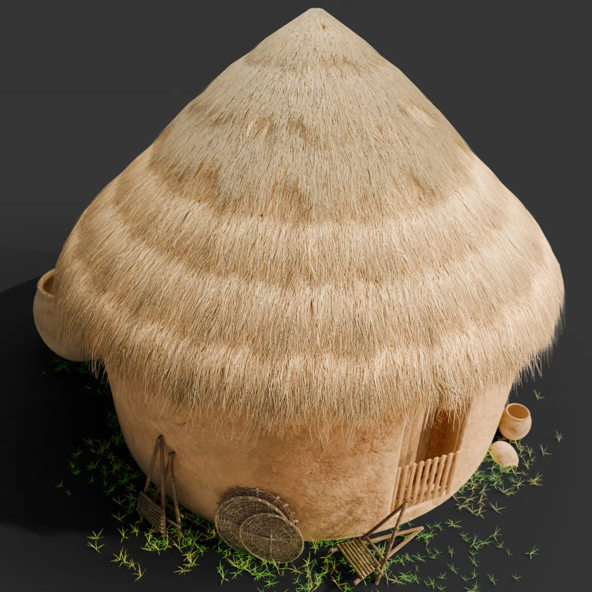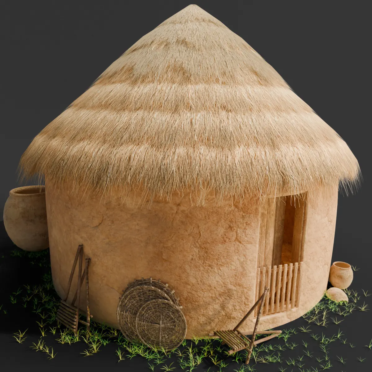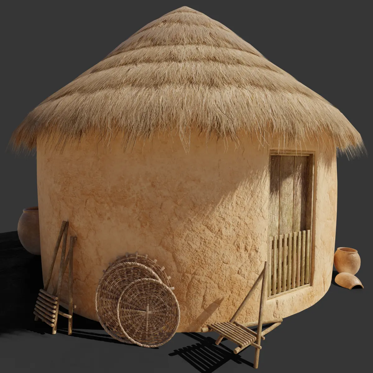 Photo-realistic, game-ready model of traditional CG African mud hut 3D and props.