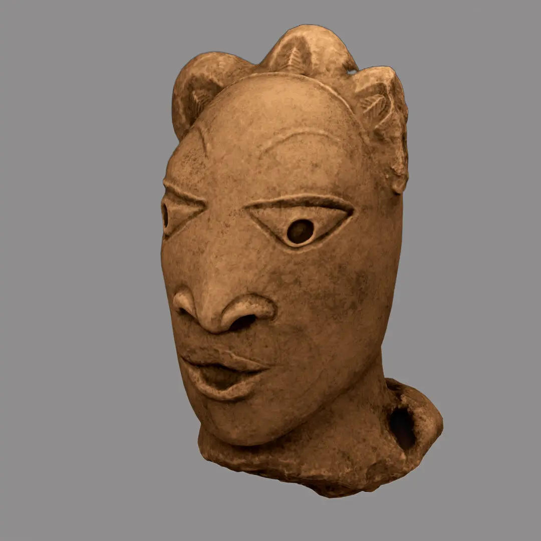 Nok Head This terra cotta head was once attached to a statue, but was found in a riverbed. It was probably destroyed in an accident because the breaking point is so uneven. It would have been attached to a life-size body and was probably inlaid with glass and painted. In the head, there are holes that would have allowed for decoration such as beads. Because of this, historians say that this figure is a god or effigy of the leader. The body would have been dressed and decorated as well as the head.