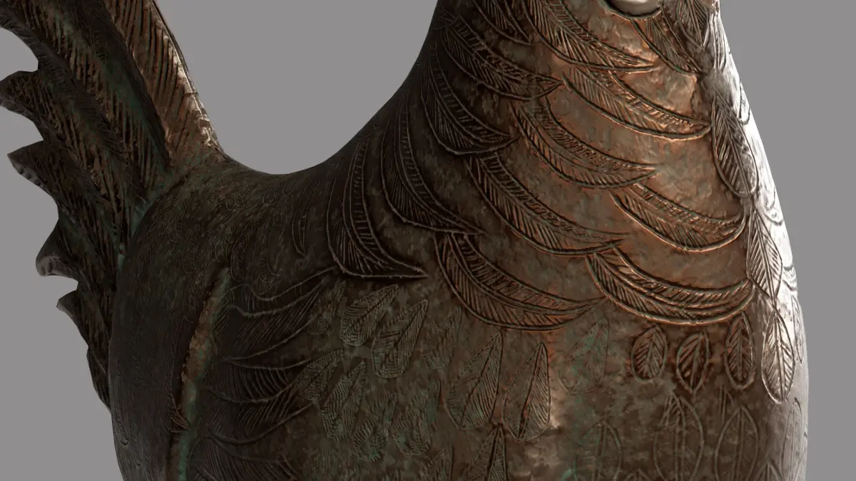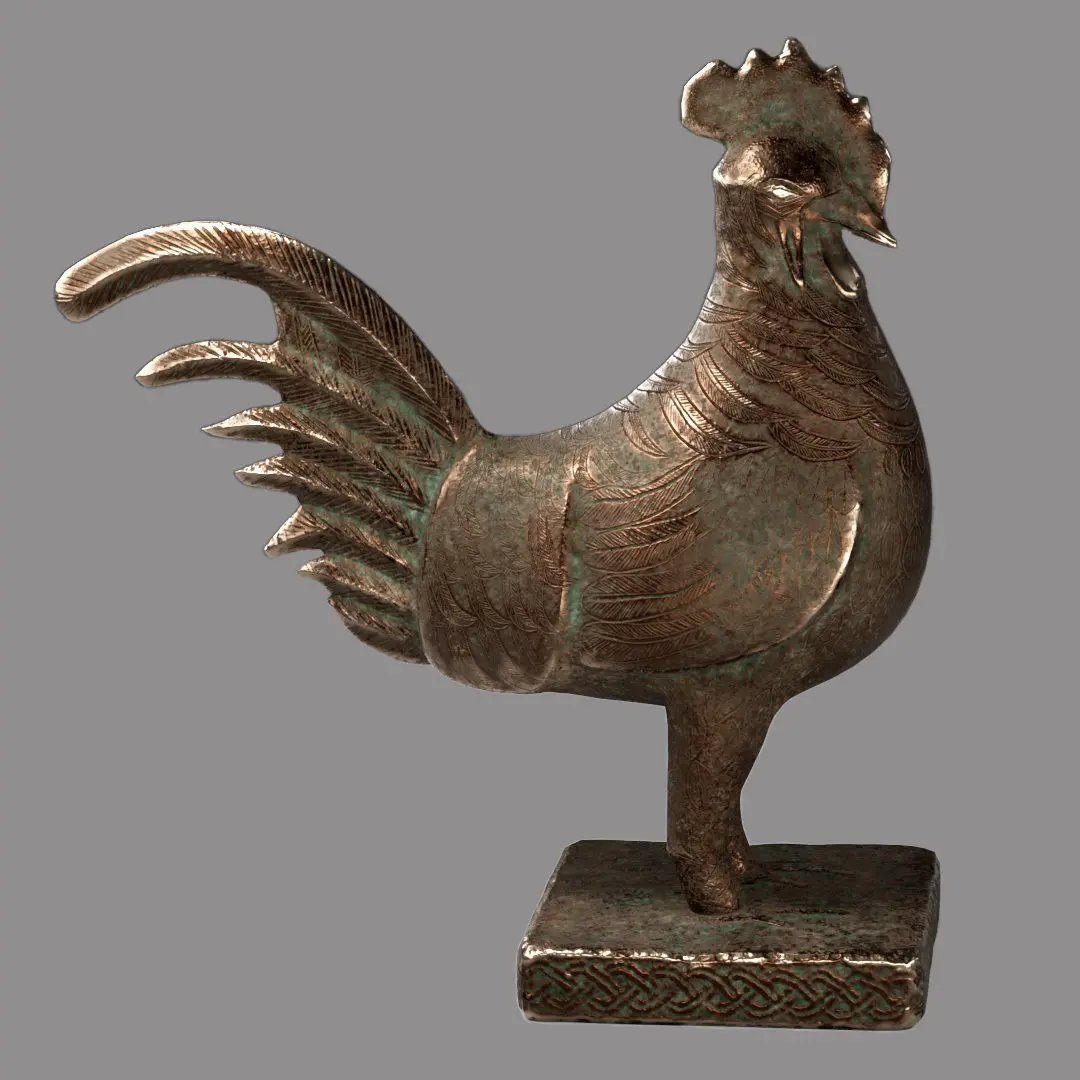The cock is an important animal in the religion of Benin, treated as a worthy animal sacrifice to deities such as Olokun, a spirit of wealth and of the sea. More than two dozen bronze cocks (Eson) are known in the art of Benin, dated between the 17th and 19th centuries. These statues of male chickens were typically cast using a lost wax process, modelled with comb, tail and spurs, and incised patterns representing feathers, mounted on a large square base which was often decorated with a guilloche pattern. They may have been ceremonial objects, displayed on an ancestral altar commemorating an Iyoba of Benin (a queen mother), an unusual example of a male animal being used to commemorate a woman, attributable to the traditional power and privileges of the queen mother.