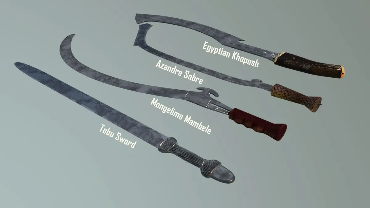 A bundle of four different African swords from East Africa. The Azande SabreThe Egyptian KhopeshThe Mongelima MambeleThe Tebu Sword