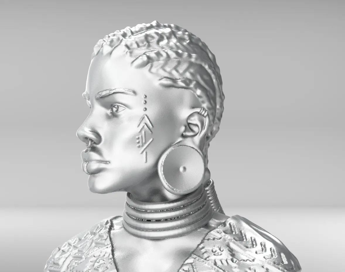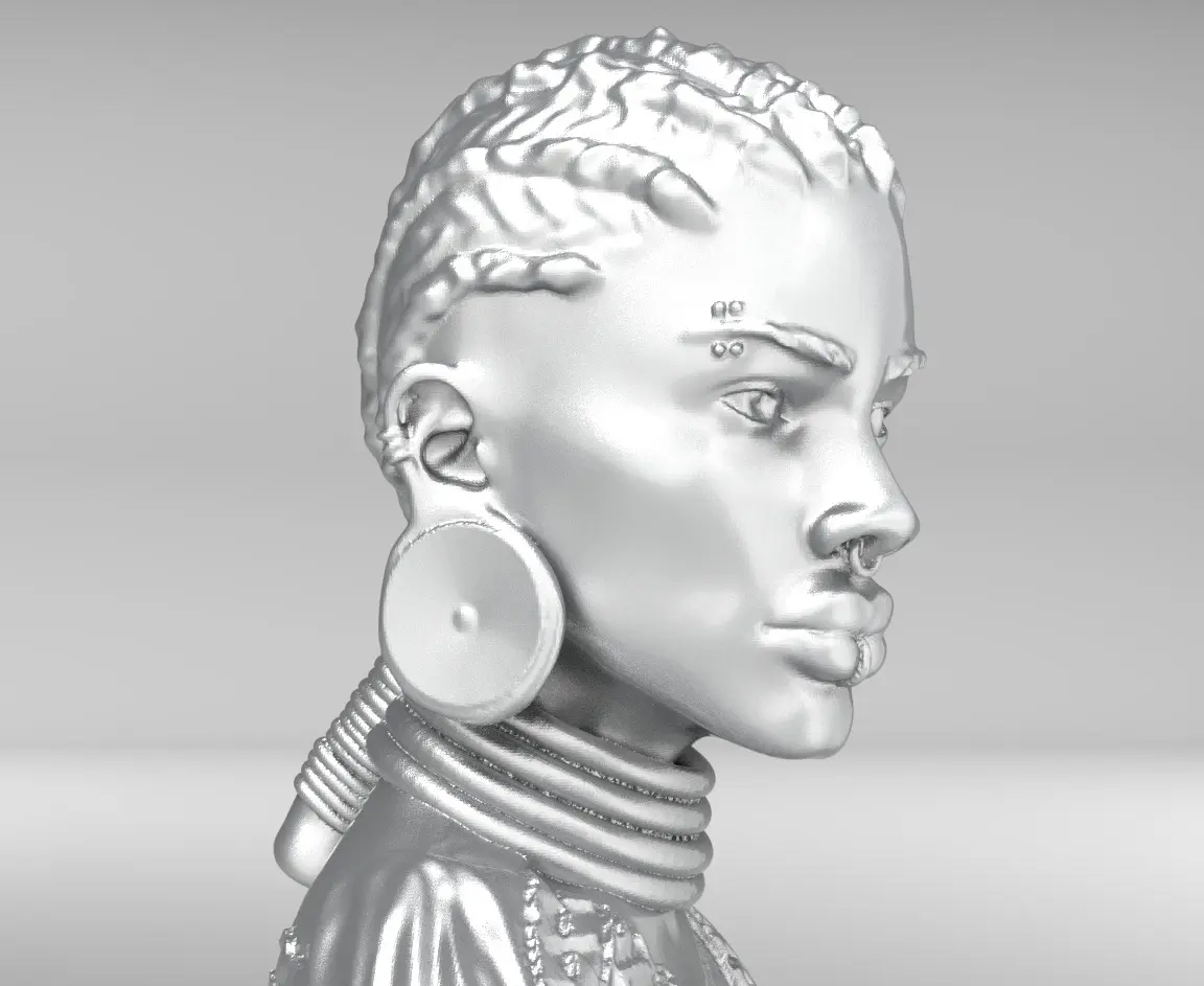 This high-quality 3D bust model features an African woman with intricate facial details and piercings, designed for decorative and artistic applications. The model is optimized for 3D printing and can be scaled to different sizes without losing detail.