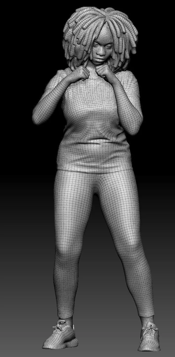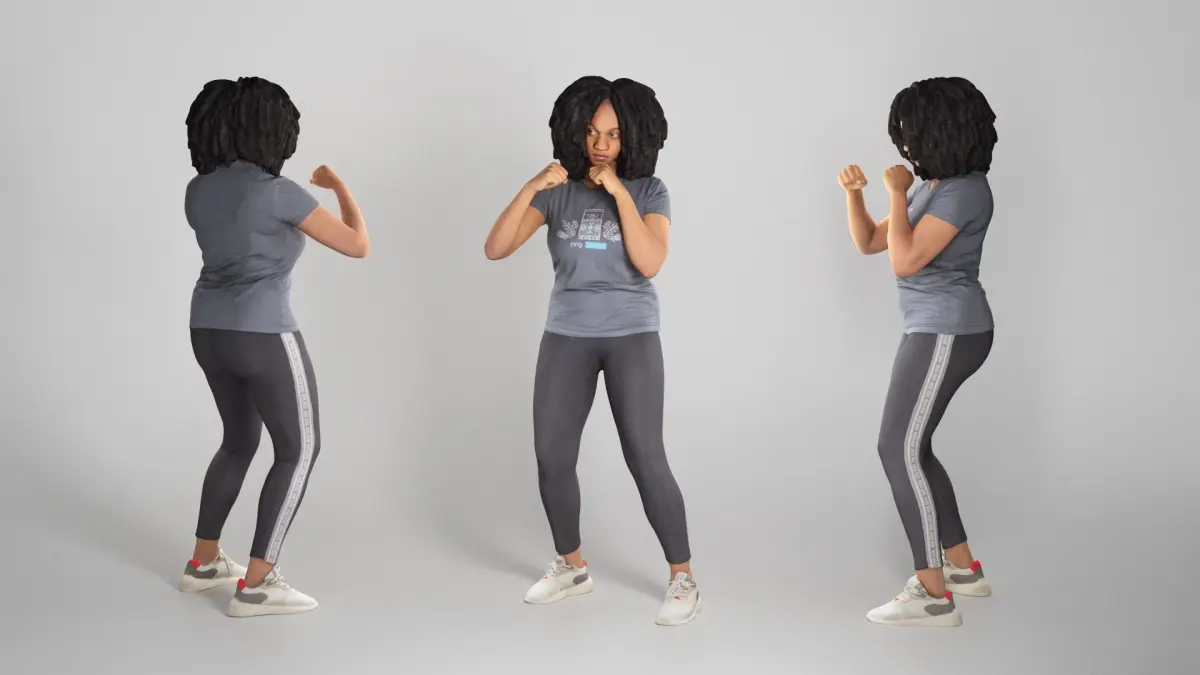This is a true human size and detailed model of a sporty beautiful young woman of African appearance in sportswear. The model is captured in casual pose to be perfectly matching for variety of architectural visualizations, e.g. sport ground, gym, boxing ring, park, VR/AR content, etc.