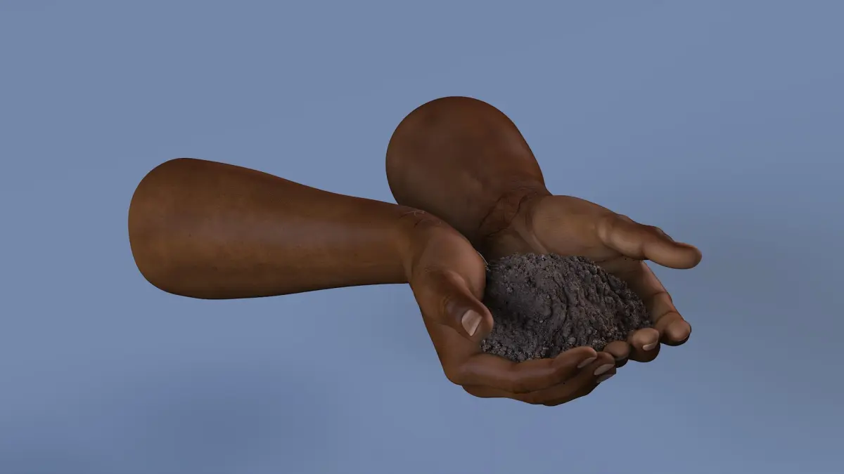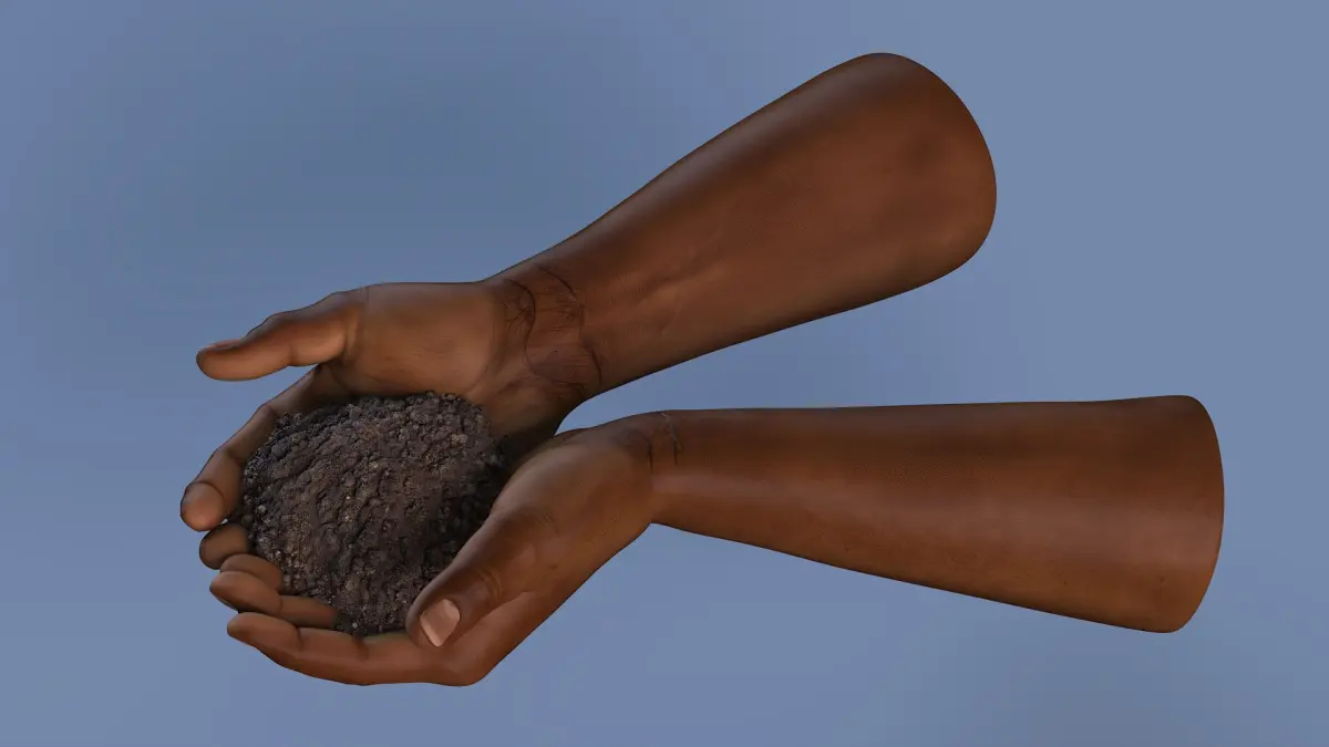 Afro American Hands Holding Soil is a 3d model of a pair of Afro-American hands gently holding soil, symbolizing the connection between humanity and the earth.