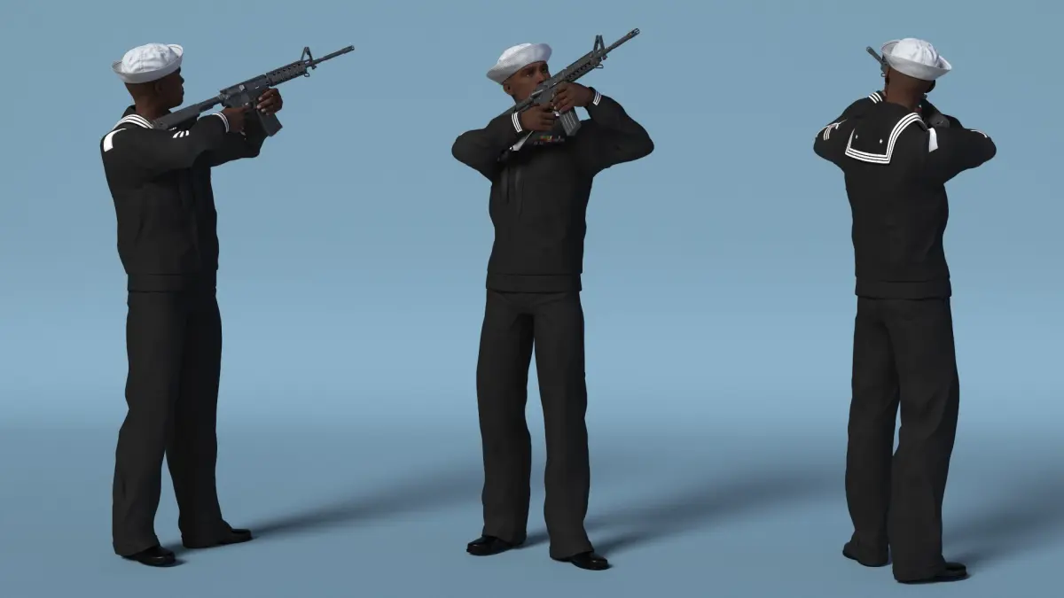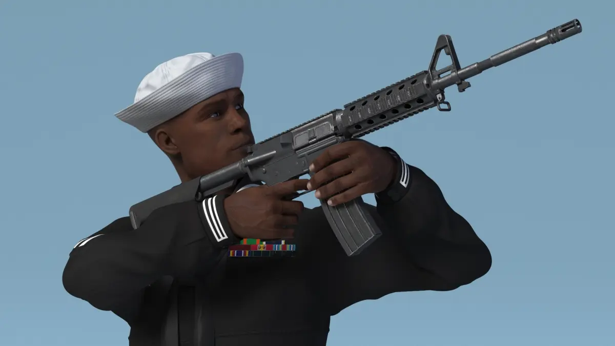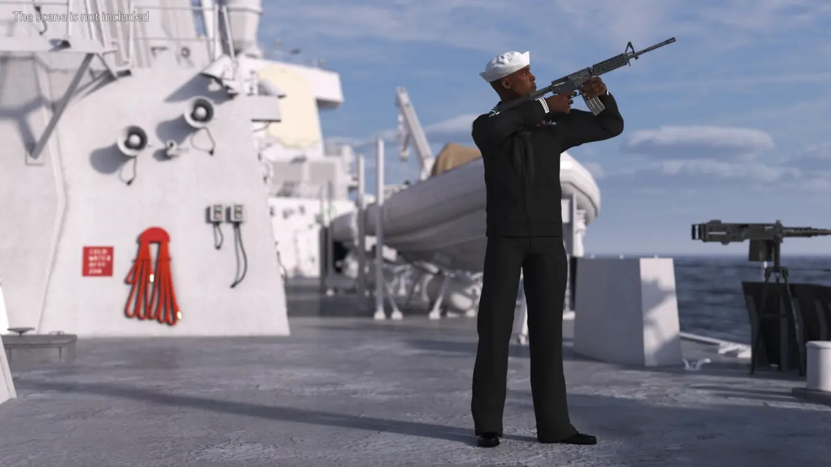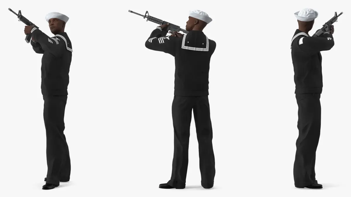 Afro American Sailor in Black Uniform with Rifle is a three-dimensional model of a sailor wearing a traditional navy uniform while holding a rifle.