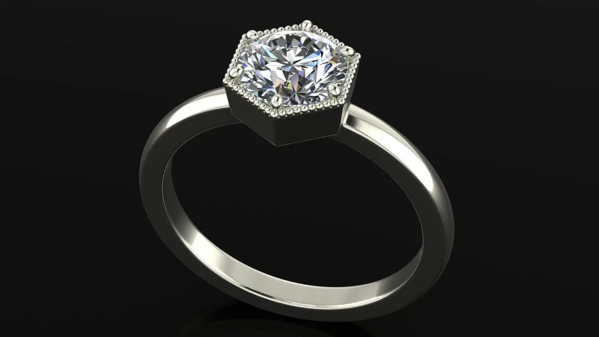 The band, available in options like white gold, yellow gold, or platinum, features a smooth, polished finish that enhances the ring's contemporary appeal. The hexagonal shape not only adds a fresh aesthetic but also symbolizes harmony and balance, making it a meaningful choice for engagements or special occasions.