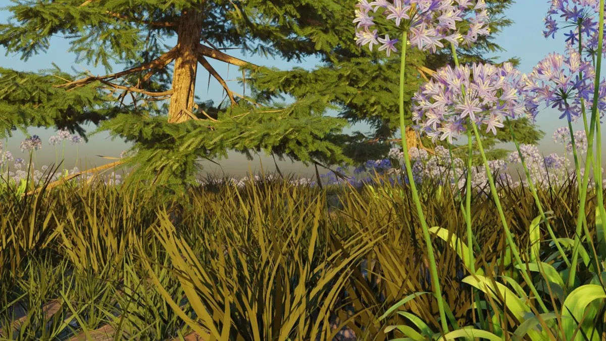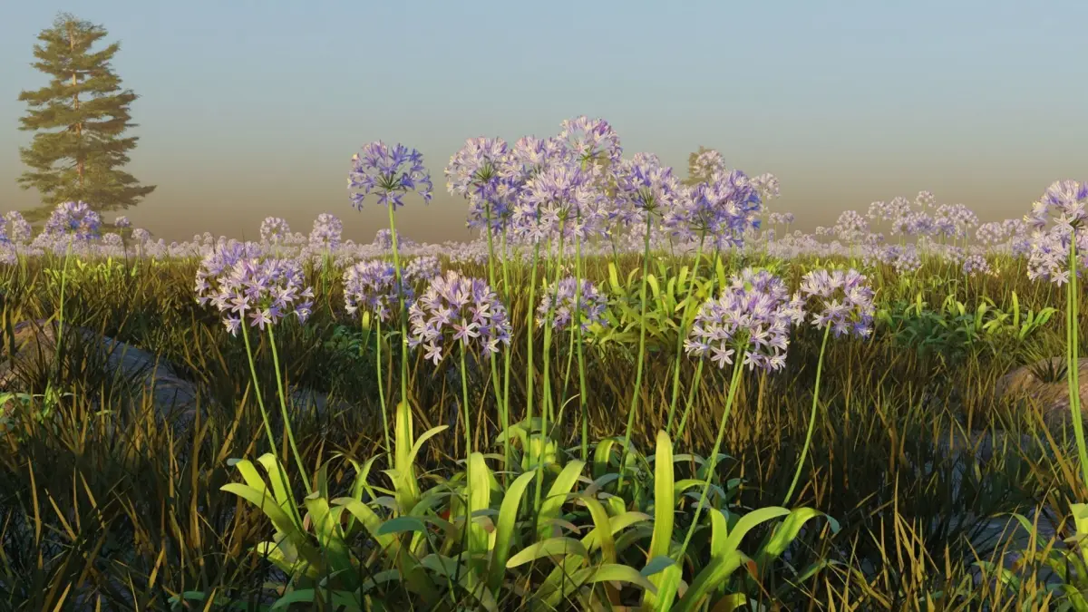 3d field scene with agapanthus, grass, stones, trees and warped landscape.