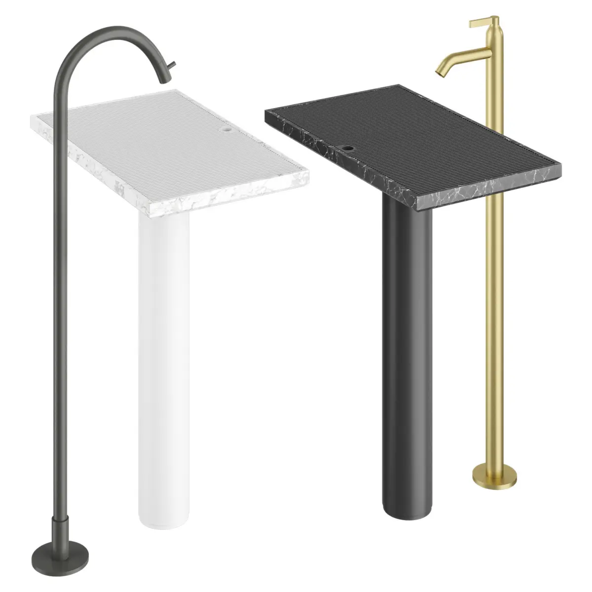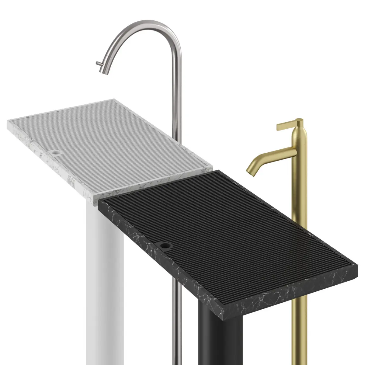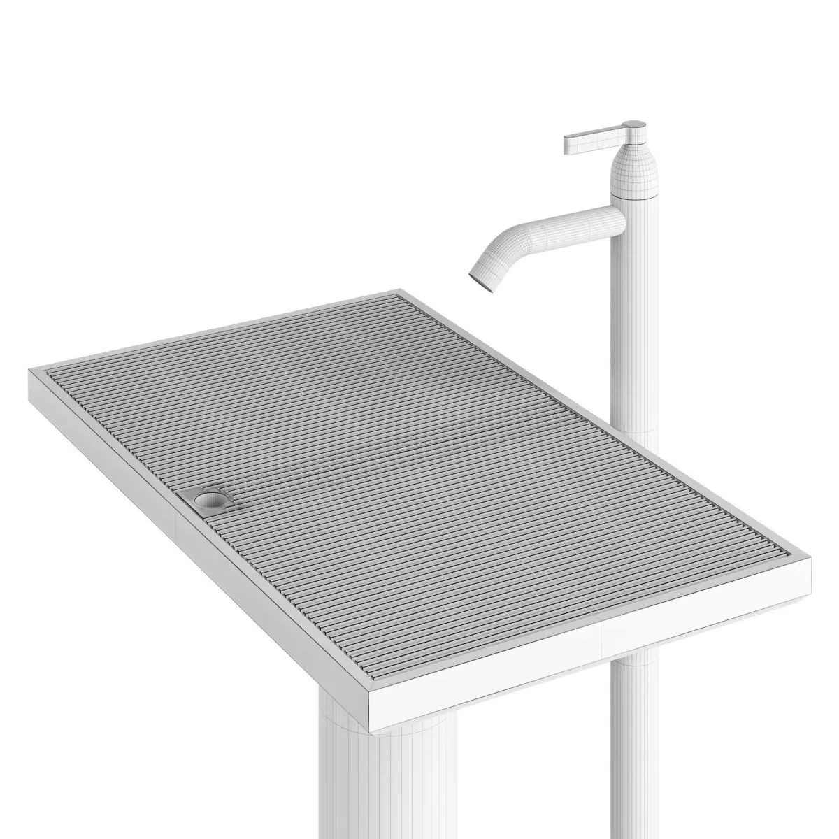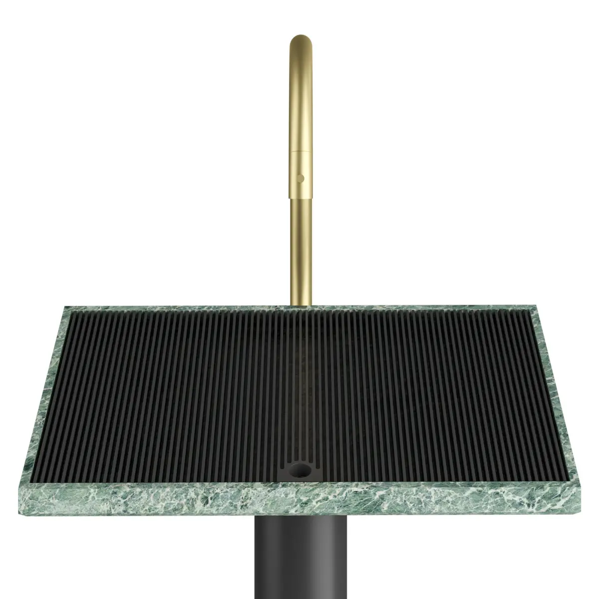 The Ell washbasin is iconic yet light. The flat surface with the grate for the breakwater is also a washbasin and they become one element.