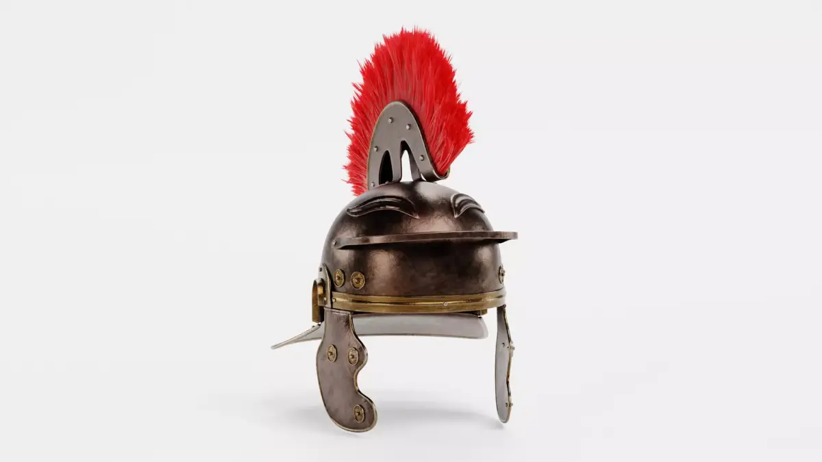 - Centurion helmet with worn, matte metal surfaces and patinated brass details