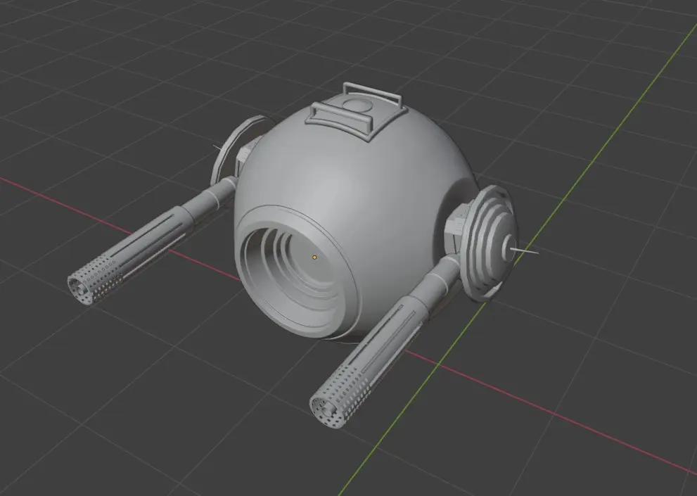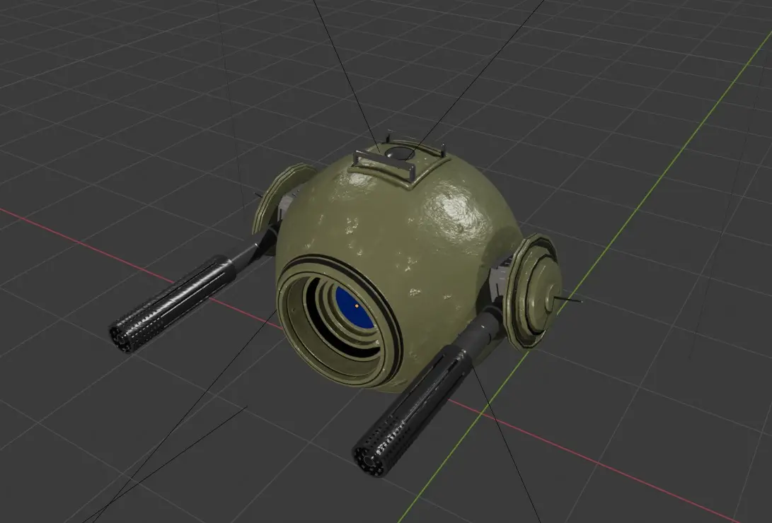 The robot ship showcases a compact spherical shape, highlighted by two steel-like guns that contribute to its imposing look. Noteworthy functional details include a door on the upper side and an engine cover on the underside. Adding to its distinctiveness, the model features a striking blue glowing face light that provides a vibrant contrast to its otherwise rugged aesthetic.
