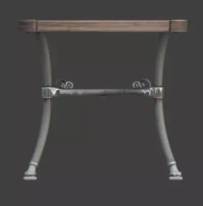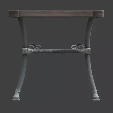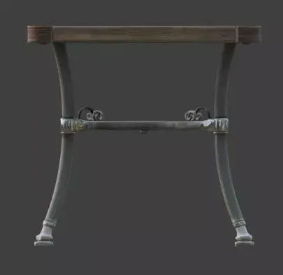 The design highlights a robust slatted timber tabletop with a protective metal border, supported by ornate curved iron legs featuring decorative scrollwork and reinforced structural joints. Engineered with clean topology and non-overlapping UVs, this game-ready prop is fully optimized for real-time engine integration, architectural visualizations, and immersive environmental storytelling.