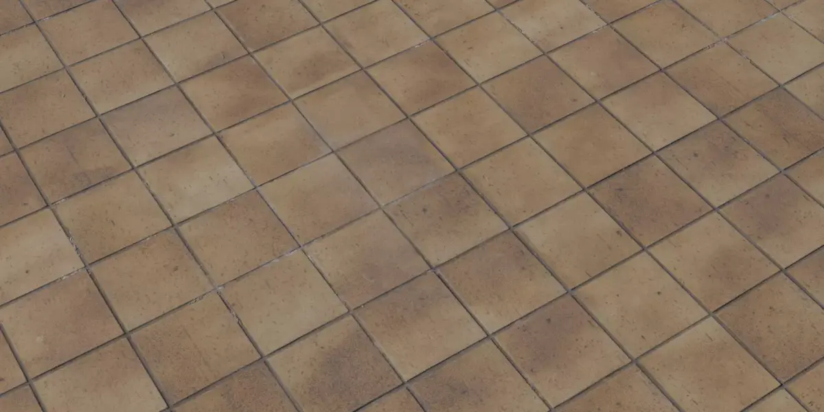 Authentic aged terracotta look with edge chips, stains, and convincing grout depth for photoreal close‑ups.