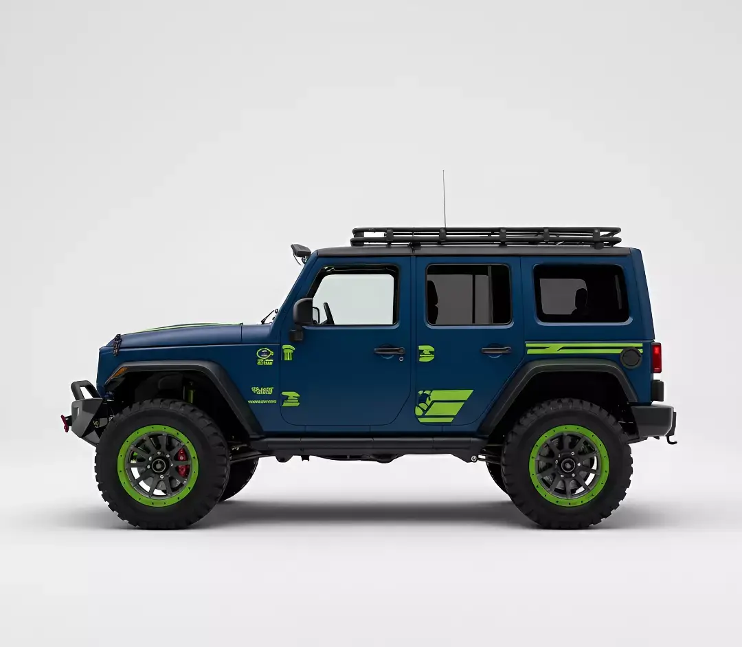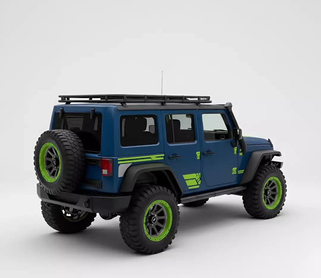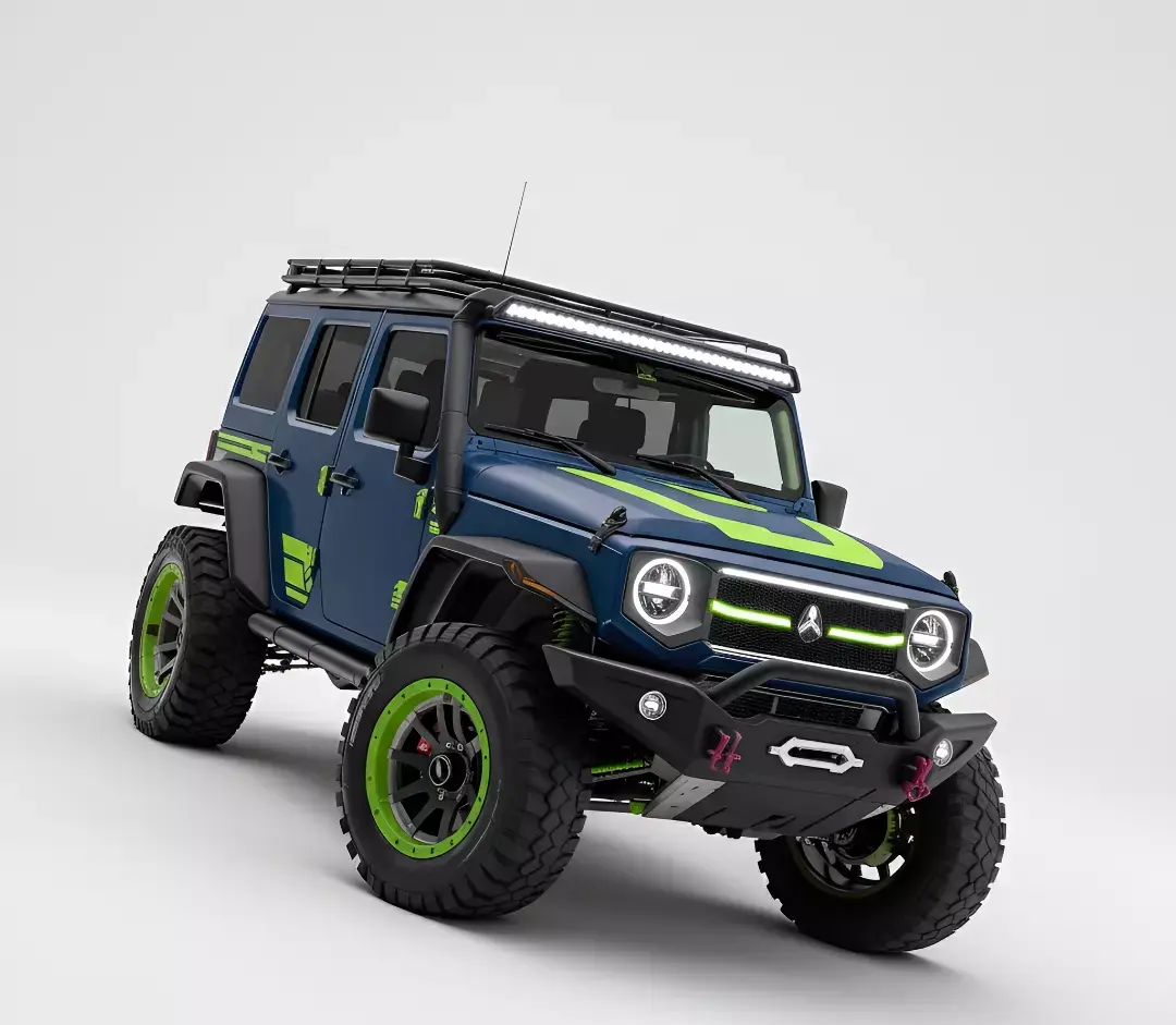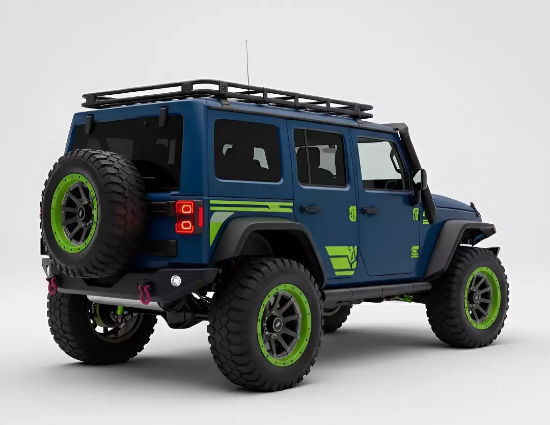 A striking 3D model of a customized, high-performance off-road vehicle. This model stands out with its bold blue body and dynamic neon green stripes and accents, including the wheels and hood decals. It features extensive off-road modifications, such as a lifted suspension, large knobby tires, an aggressive front bumper with a winch, and a roof rack equipped with an oversized LED light bar. The high level of detail makes this asset perfect for creating exhilarating renders, adding an adventurous element to game environments, or showcasing custom vehicle designs in a digital showroom.