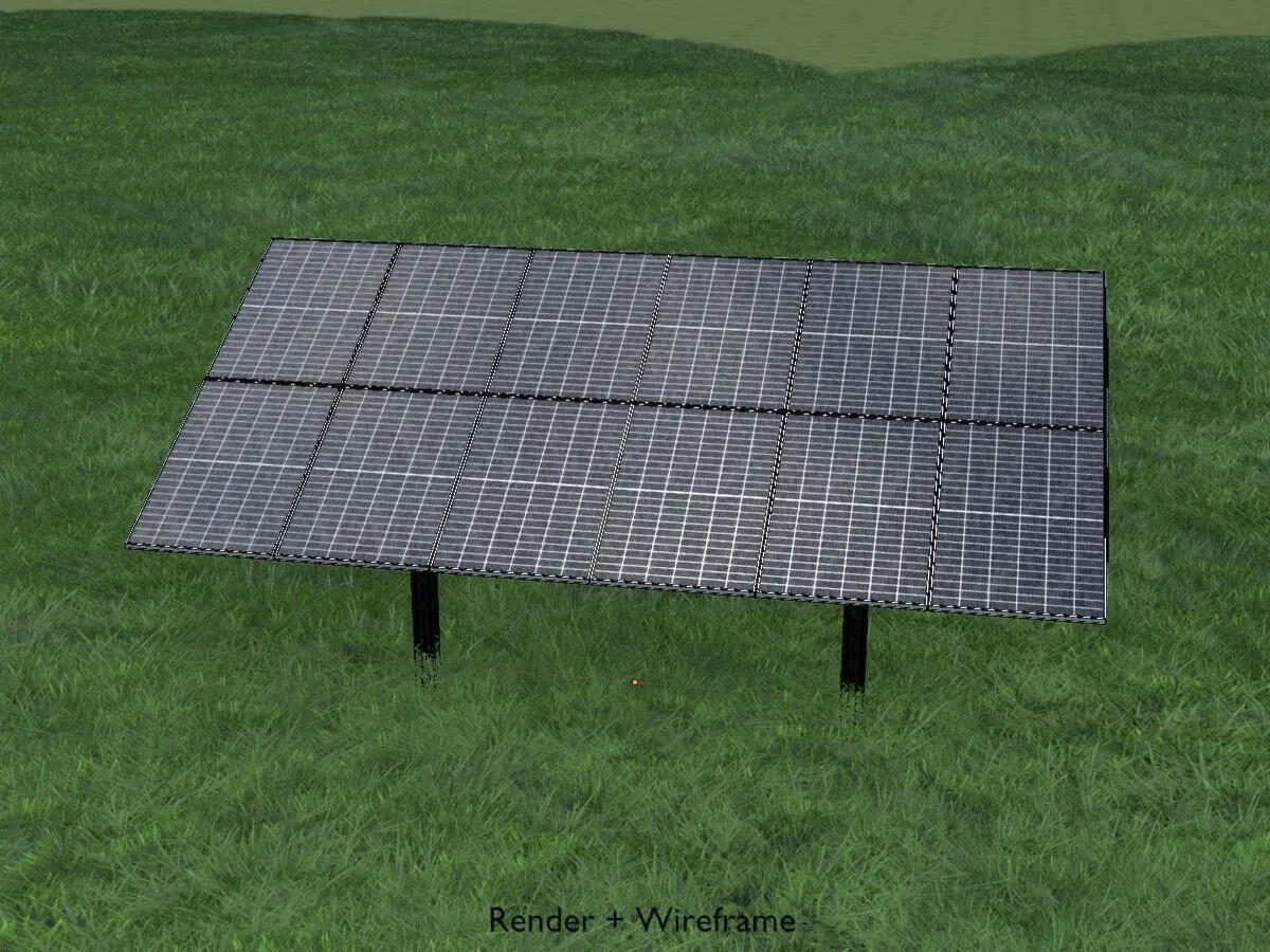 - Hier sehen Sie ein 3D-Modell einer Agri-Photovoltaik-Solaranlage mit einem Neigungswinkel von 120° und einer Breite von 8 Metern.