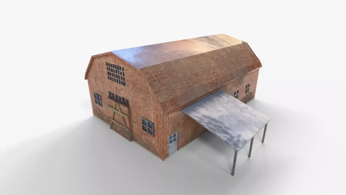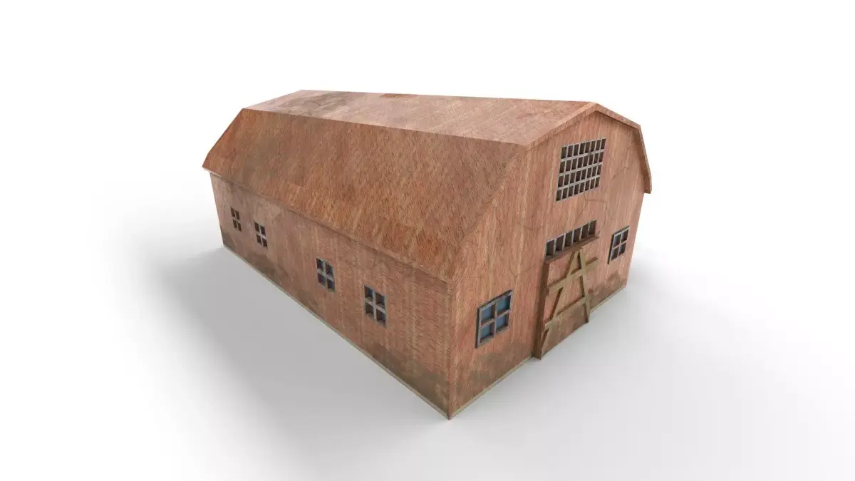 This detailed farm building is a versatile asset designed for use in games, animations, simulations, and architectural visualization. The structure features a classic wooden barn style with weathered textures, large windows, and a covered side extension that adds realism and functionality to rural or industrial environments.