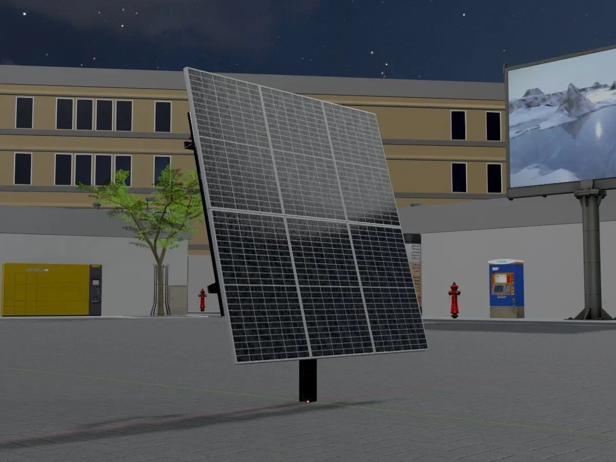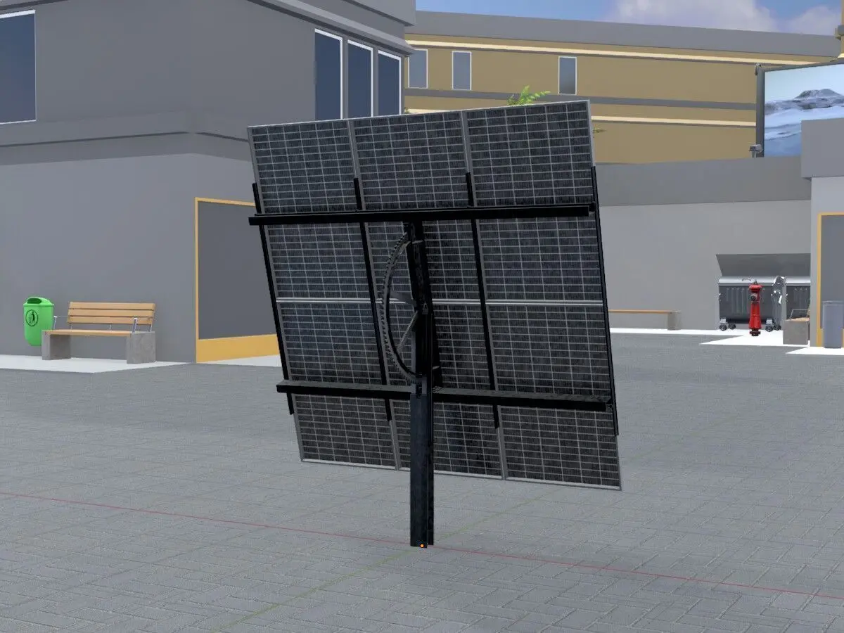- Here you can see a 3D model of an agrivoltaic solar system with an inclination angle of 165° and a width of 4 meters.