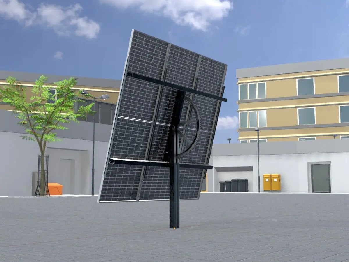 - Hier sehen Sie ein 3D-Modell einer Agri-Photovoltaik-Solaranlage mit einem Neigungswinkel von 165° und einer Breite von 4 Metern.
