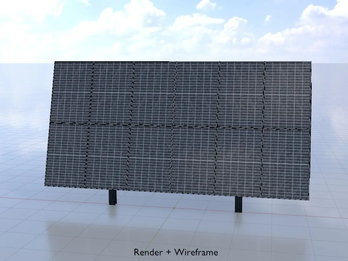 - Hier sehen Sie ein 3D-Modell einer Agri-Photovoltaik-Solaranlage mit einem Neigungswinkel von 165° und einer Breite von 8 Metern.