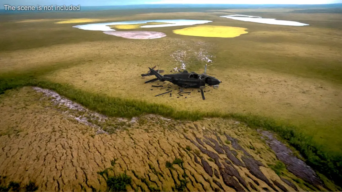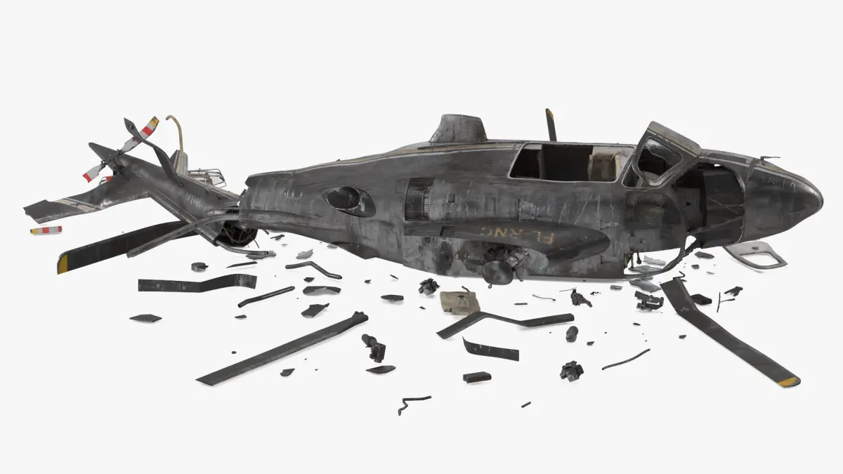 Agusta AW109S Crash During Rescue Training is a 3d model of a broken and scattered helicopter, showcasing detailed wreckage with various parts dispersed.