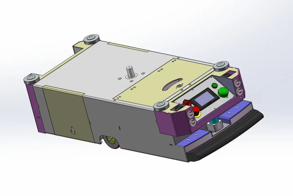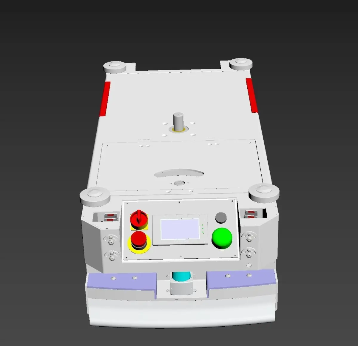 AGV carrier car, which drives two sets of wheels through two sets of stepper motors, has a set of electric cylinders to drive up and down the lifting mechanism in the middle part. Under the control of sensors and control devices such as touch screen-HMI, it can realize the unmanned carrying function