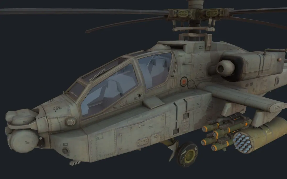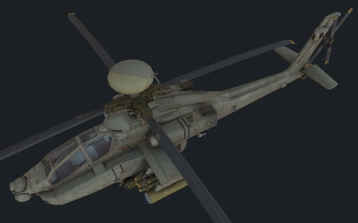 The AH-64 Apache is a four-blade, twin-engine attack helicopter with a tailwheel-type landing gear arrangement, and a tandem cockpit for a two-man crew.
