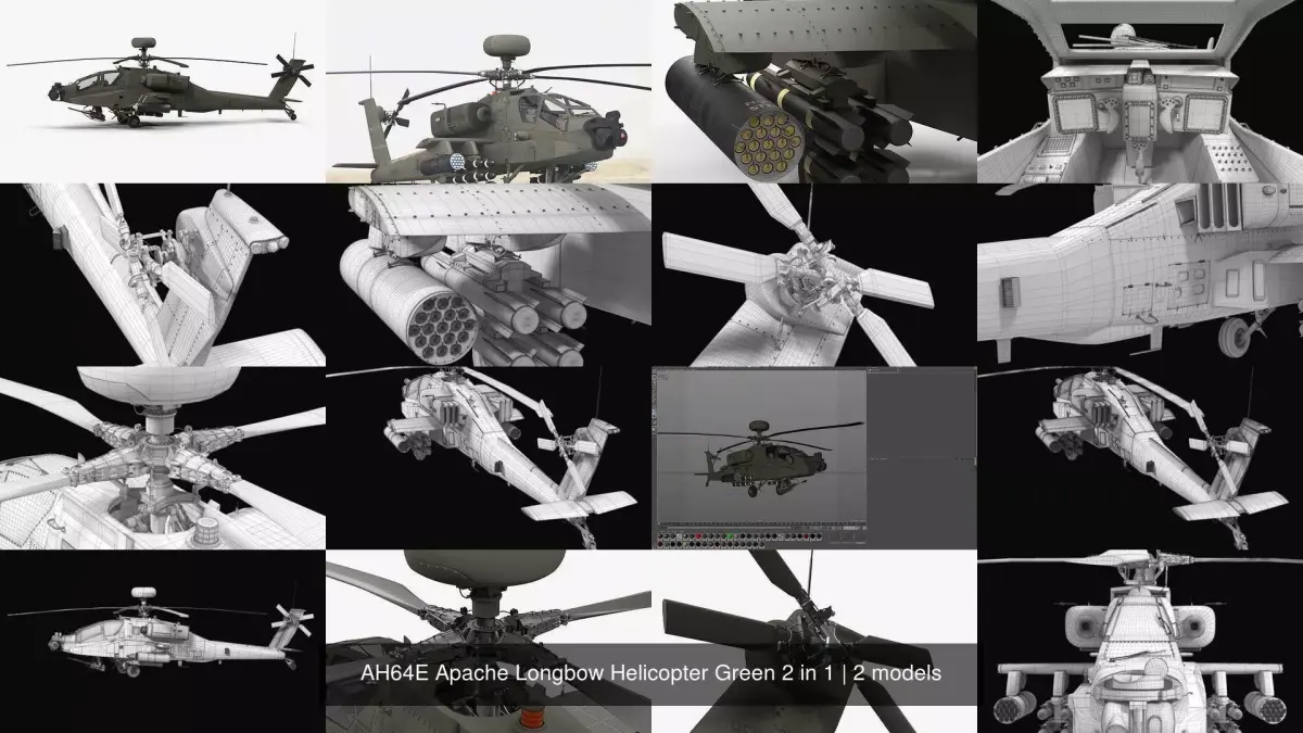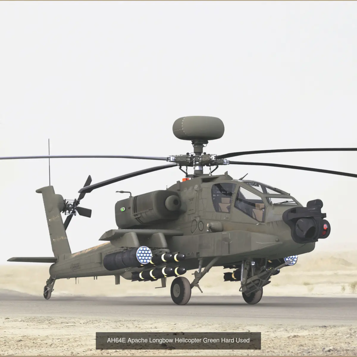 This *AH64E Apache Longbow Helicopter Green 2 in 1 Clean & Hard used * is a high-quality, photo-real model that will enhance detail and realism to any of your rendering projects. The model has a fully textured, detailed design that allows for close-up renders and was created by CGEAS.