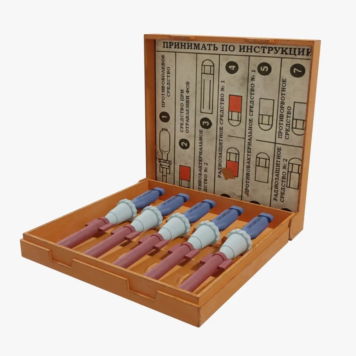 Hi, this is a realistic 3D model of an Ai-2 first aid kit and a Promedol syringe.