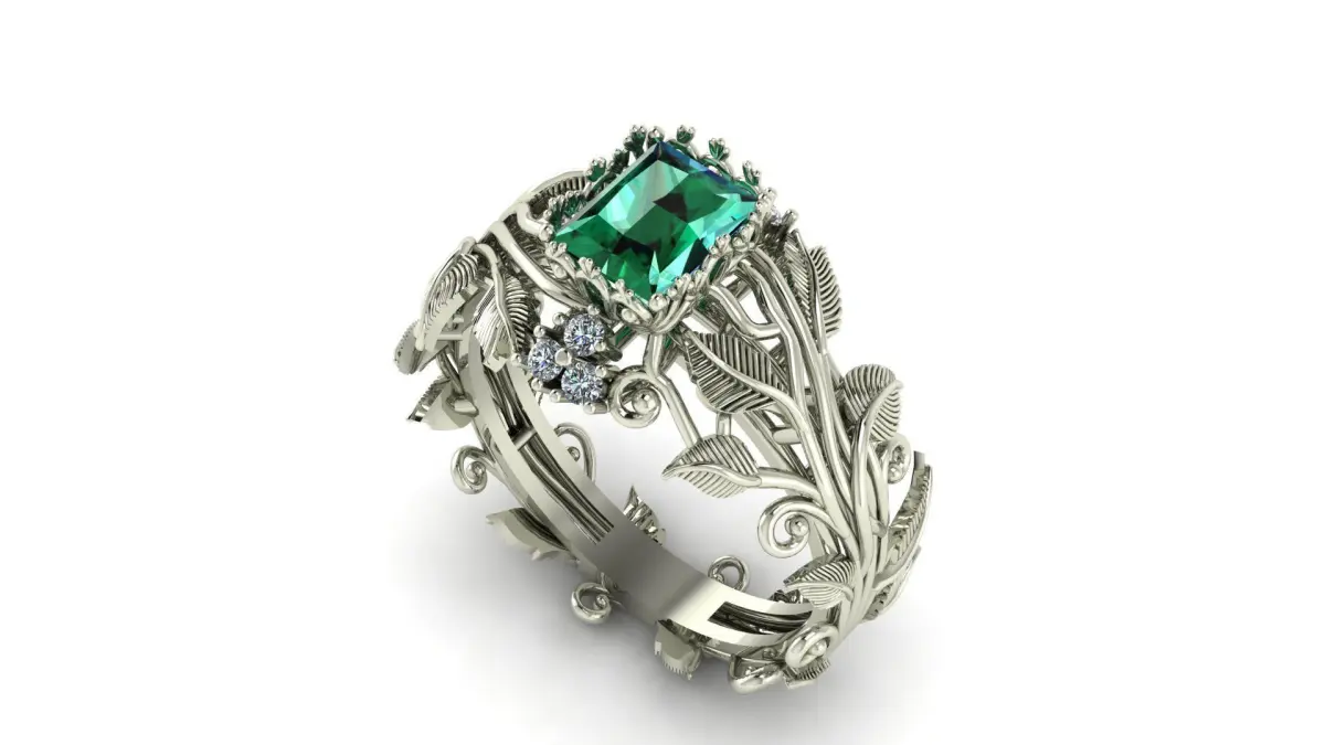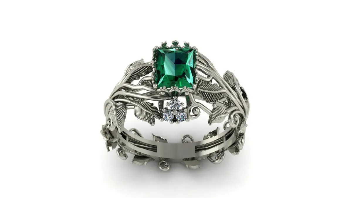 This exquisite gold ring features a stunning emerald stone at its center, surrounded by delicate and intricately designed leaves that add a touch of elegance and sophistication to the piece. Crafted with attention to detail, this ring is perfect for those who appreciate fine jewelry and want to make a statement with their accessories. The vibrant green hue of the emerald stone contrasts beautifully with the warm tones of the gold, creating a timeless and luxurious look that is sure to turn heads. Ideal for special occasions or as a unique addition to your everyday wardrobe, this ring is a must-have for anyone who loves to stand out from the crowd.