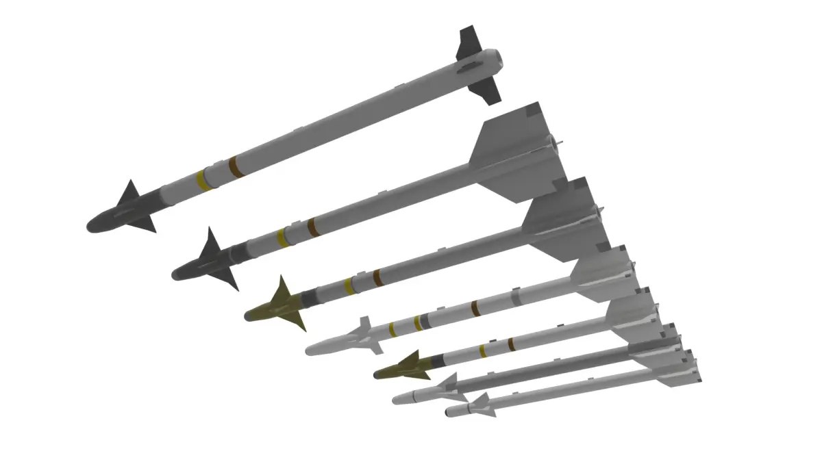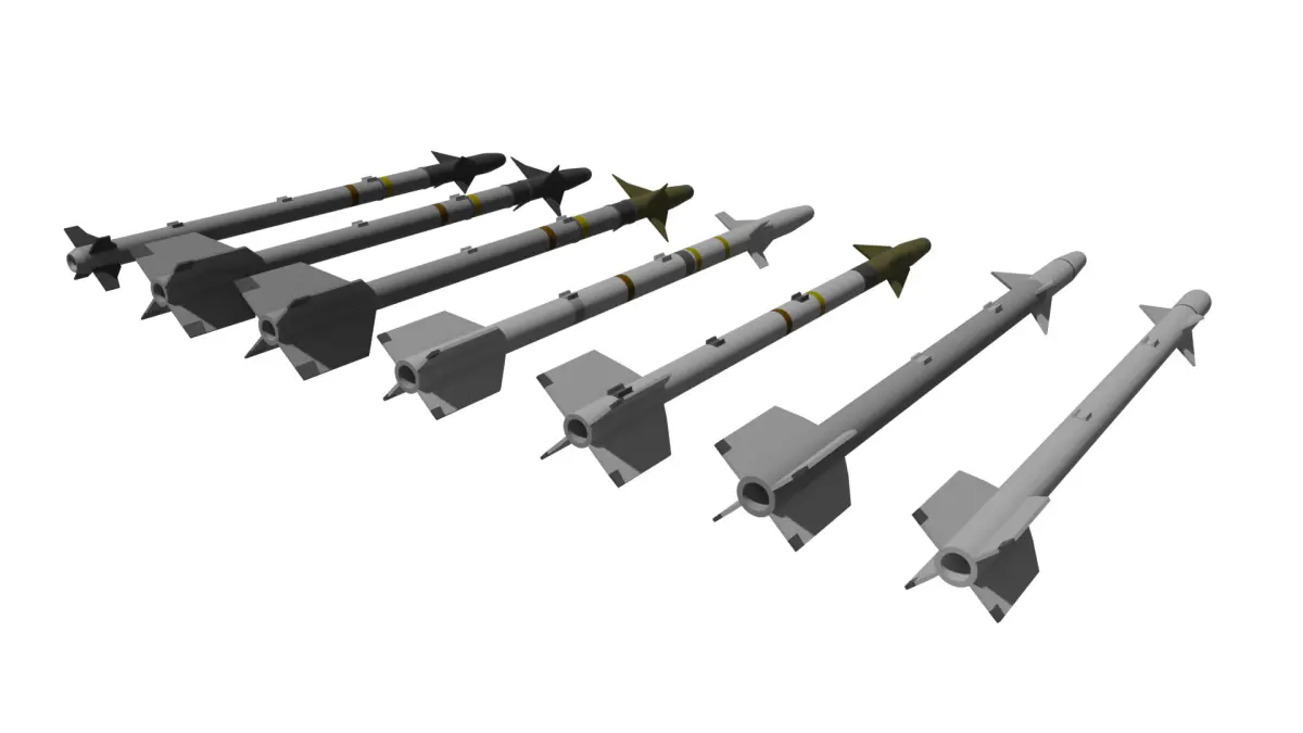 Aim-9 Sidewinders missiles collection low-poly 3D models; Collection include: Aim-9B, Aim-9E, Aim-9G/H, Aim-9J/P, Aim-9L, Aim-9M, Aim-9X; Made in Blender 4.3.2, rendered on EEVEE