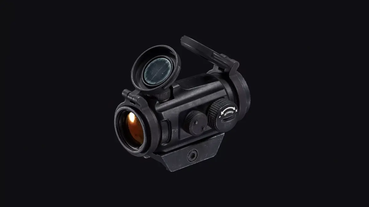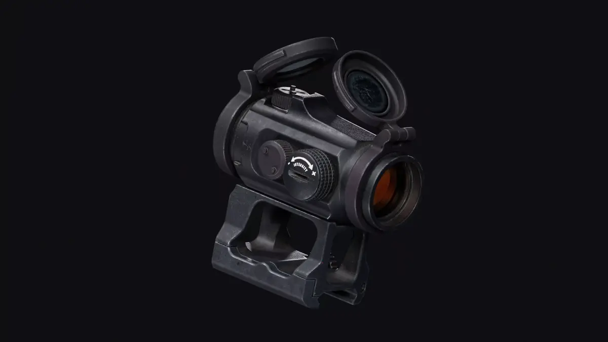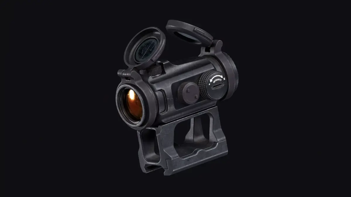 This high-quality 3D asset features a red dot sight inspired by the Aimpoint Micro T-2, completely free of logos or identifying marks for safe commercial use. It includes three mount variations: classic, high, and 45° angled, providing flexibility for different weapons and game scenarios.