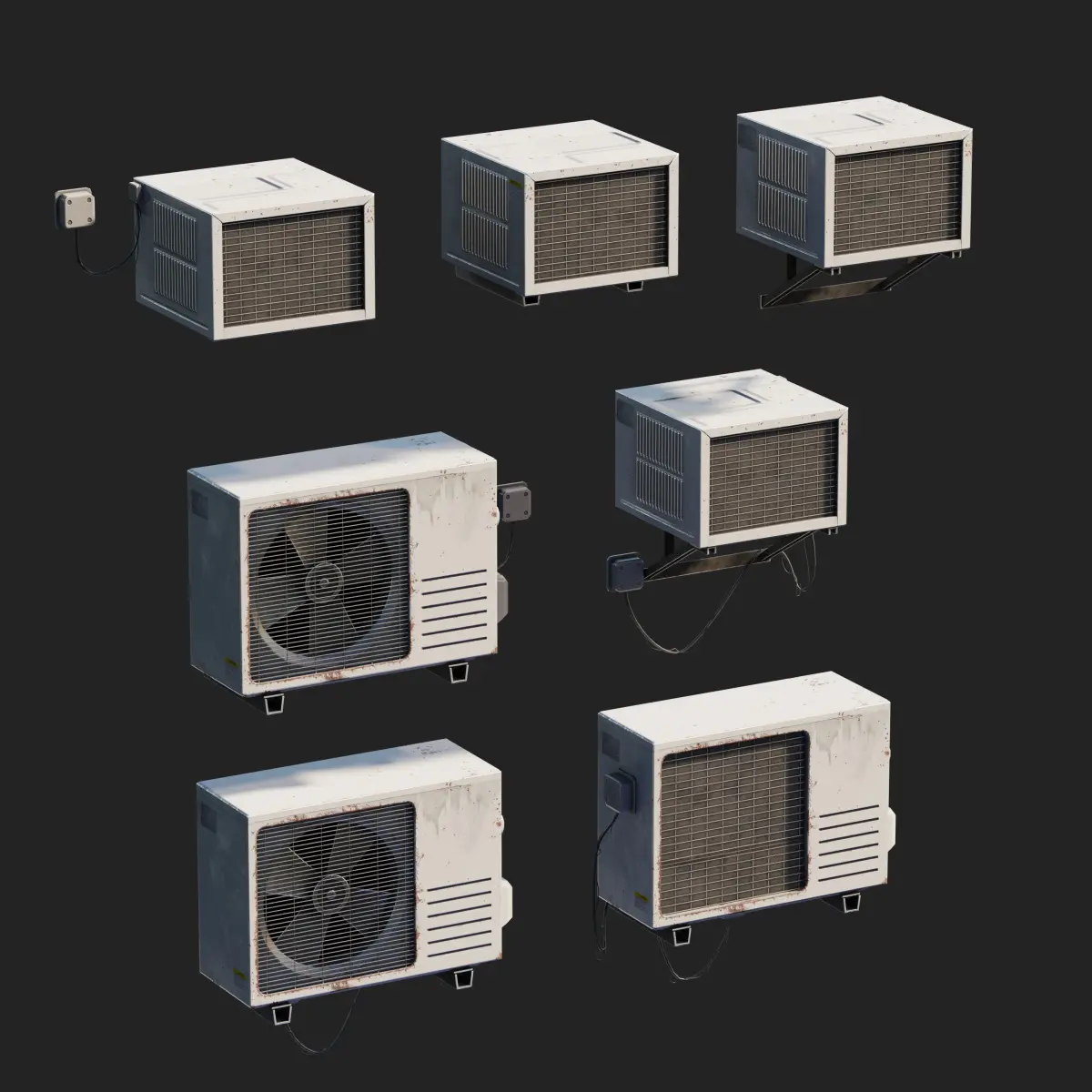Set of 3 types of Air Conditioner in 7 mount variants. Models are low-poly with PBR textures, game-ready props to use in real-time engines as well as offline rendering purposes.