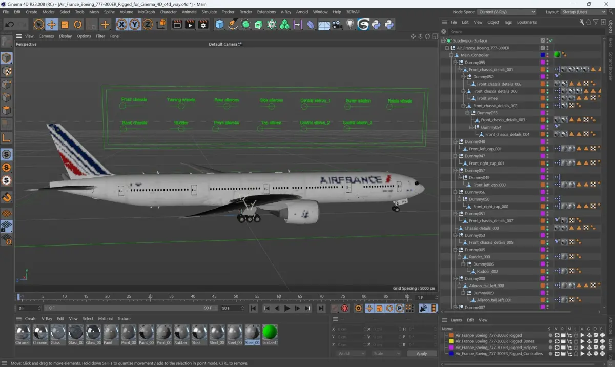 Air France Boeing 777-300ER Rigged for Cinema 4D is fully rigged and is ready to be animated in Cinema 4D. You can easily position it the way you need or animate it the way your project requires. See the screenshots to get an idea of how rigging works. The pose of the model on the render images is an example and can be recreated using rig, it is not initially included into the product.