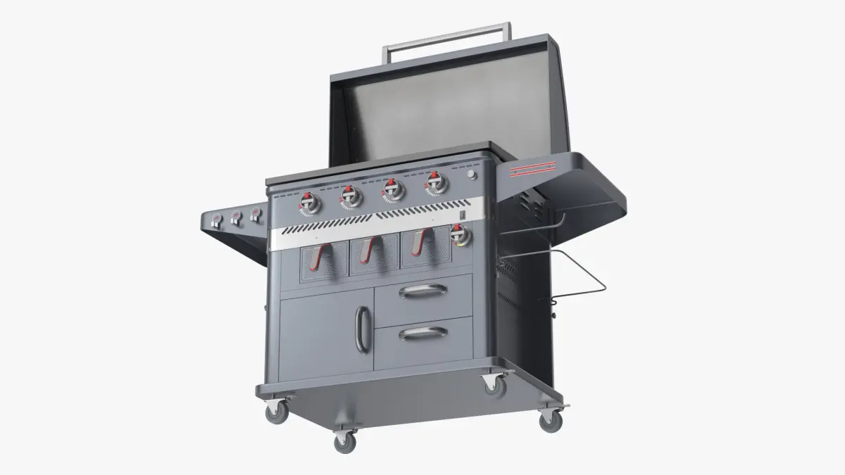 This model showcases a sleek, robust design with multiple burners and a spacious cooking surface, ideal for grilling meats like burgers, steaks, and sausages. The grill includes adjustable temperature controls, a side shelf for convenience, and a lower storage cabinet. It’s mobile with wheels, making it easy to maneuver around outdoor spaces.