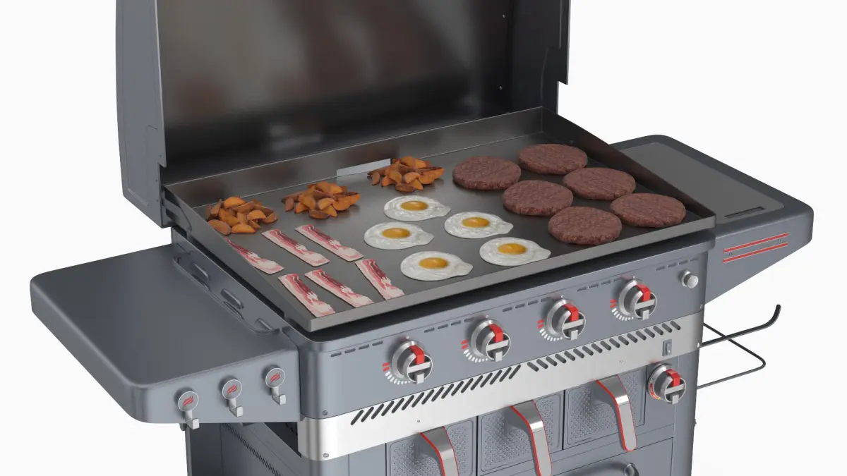Air Fryer Gas Grill with Cooking Breakfast Food in Use is a 3d model of a modern outdoor gas grill, designed for home and professional use, allowing you to grill, bake, and prepare a variety of foods.