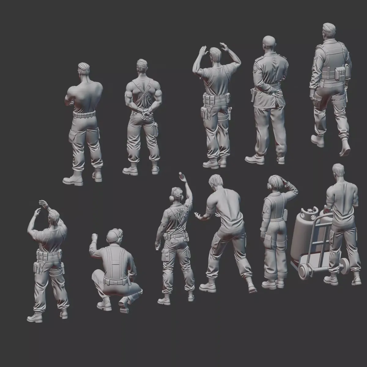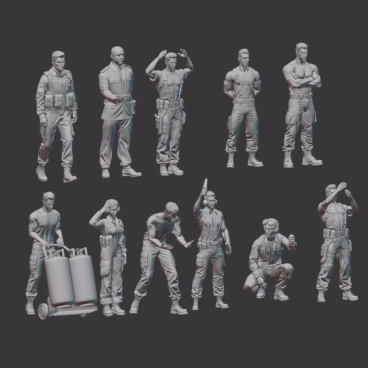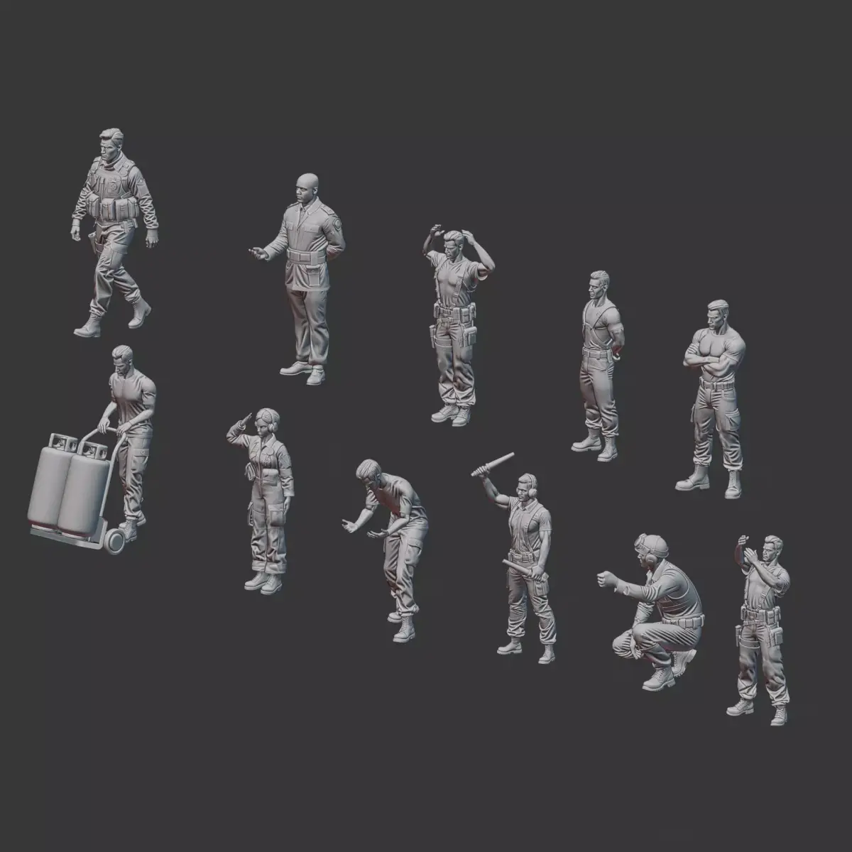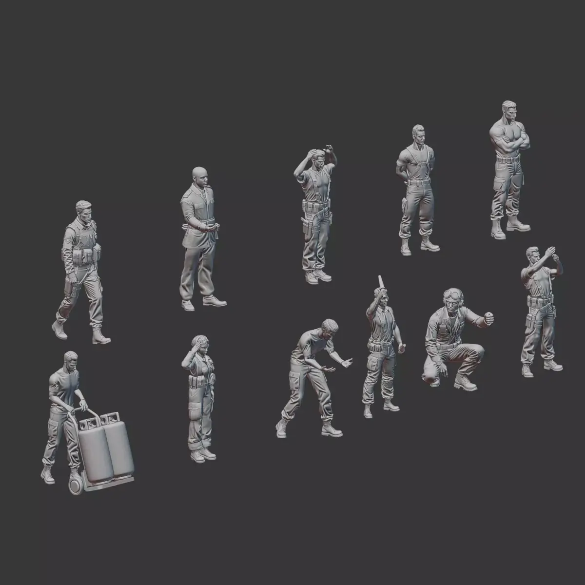 A detailed collection featuring air ground crew in realistic working poses. Includes marshallers, mechanics, and flight deck crew, each sculpted for authentic airport scenes. Perfect for aviation dioramas, aircraft displays, or hangar layouts. Provided in high-resolution resin or STL format for collectors and 3D printing enthusiasts.