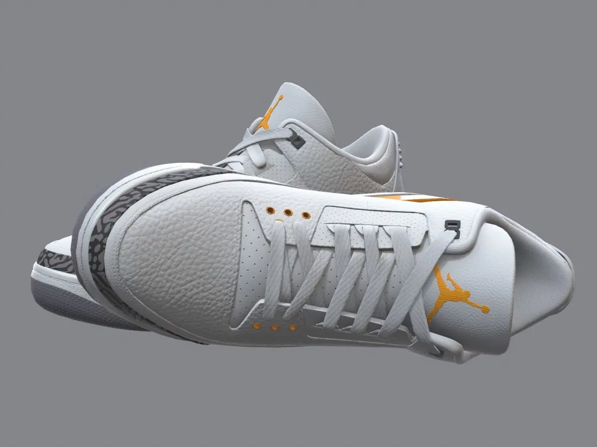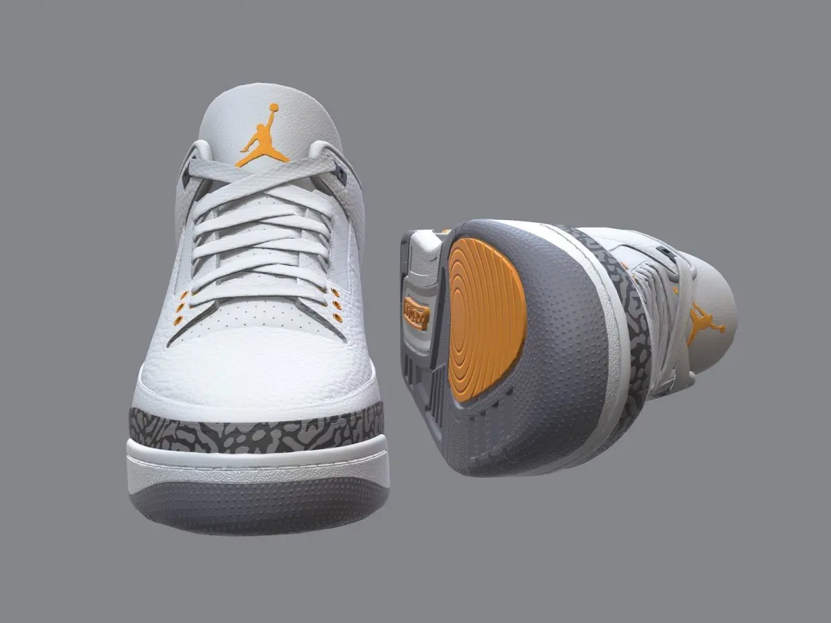 Medium poly PBR textured model of Air Jordan 3-retro sneakers (laserOrange colorway). Well textured and ready for Virtual Reality (VR), Augmented Reality (AR), games and other real-time apps for handheld devices.
