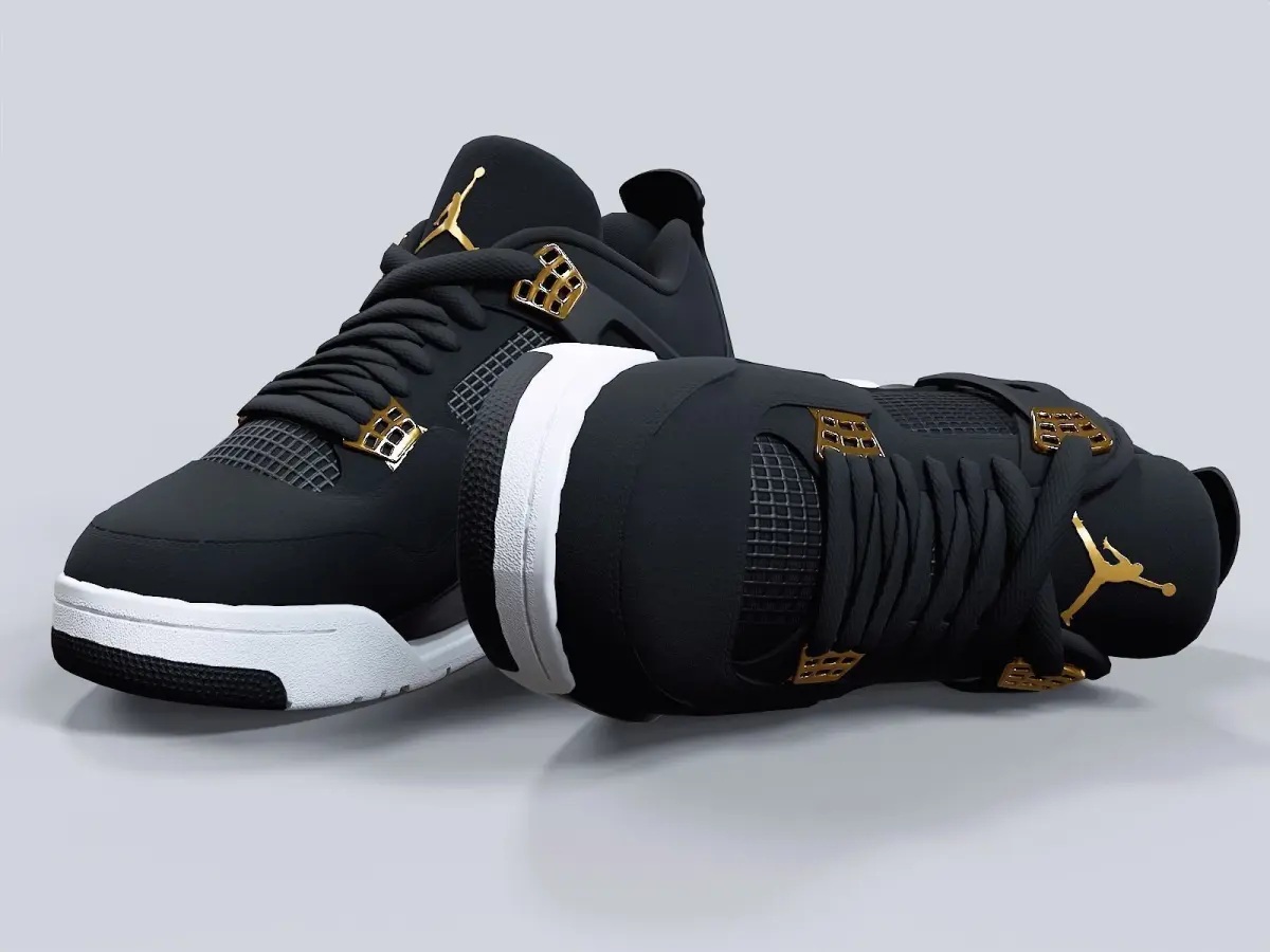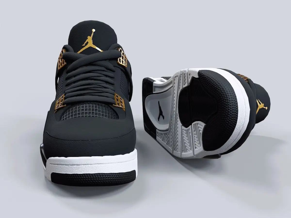Medium poly PBR textured model of Air Jordan4-retro sneaker_version-1 i.e jumpman logo at sneaker-tongue, leather heel-counter at the back (royalty colorway). Well textured and ready for Virtual Reality (VR), Augmented Reality (AR), games and other real-time apps for handheld devices.