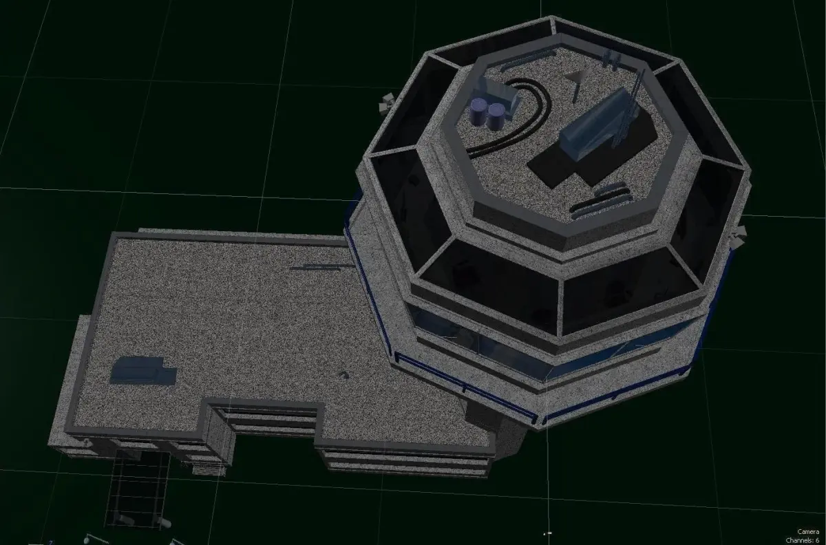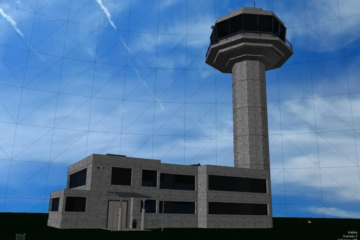 An aircraft control tower and airport traffic control room. The building and tower are detailed with exterior and main structure UV maps. The Tower and air traffic control room has desks, computers and chairs at each workstation around the glass viewing area. The building and tower roof have some roof equipment to add details. The building's front door area is detailed with covered glass and a few other objects.