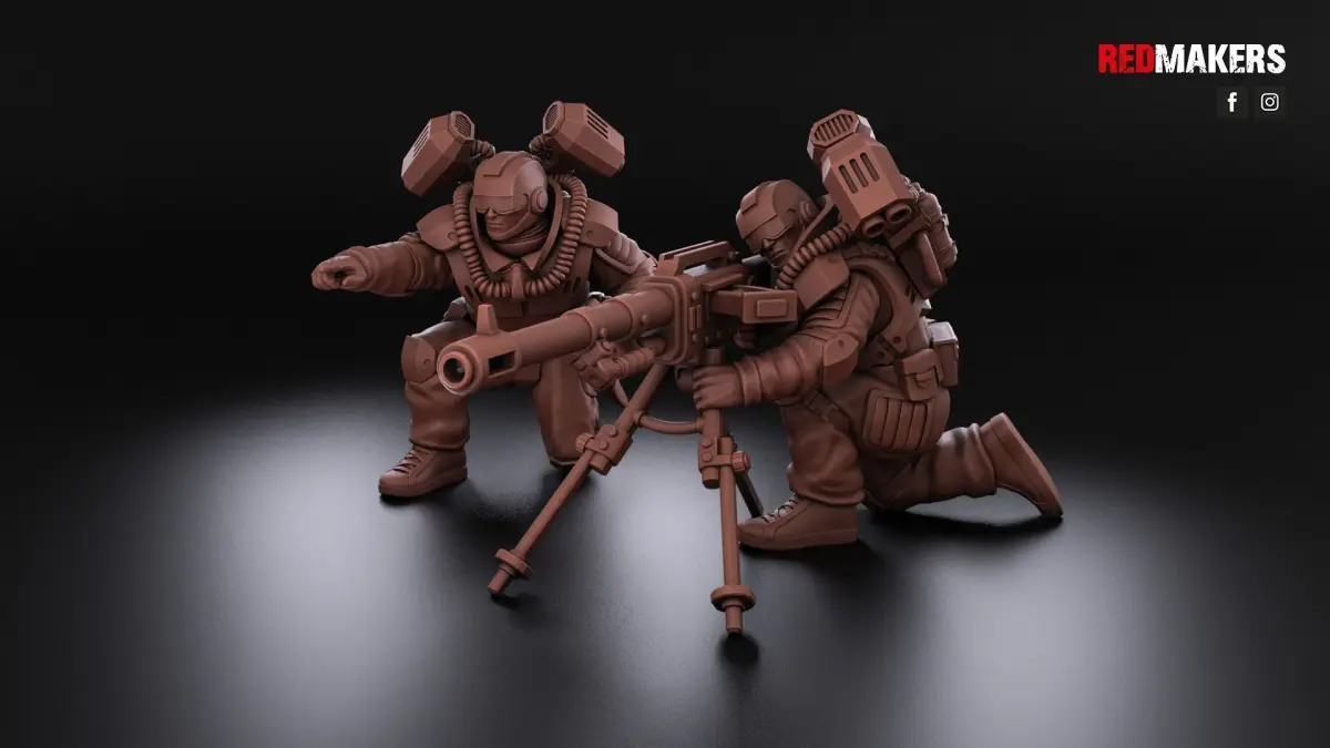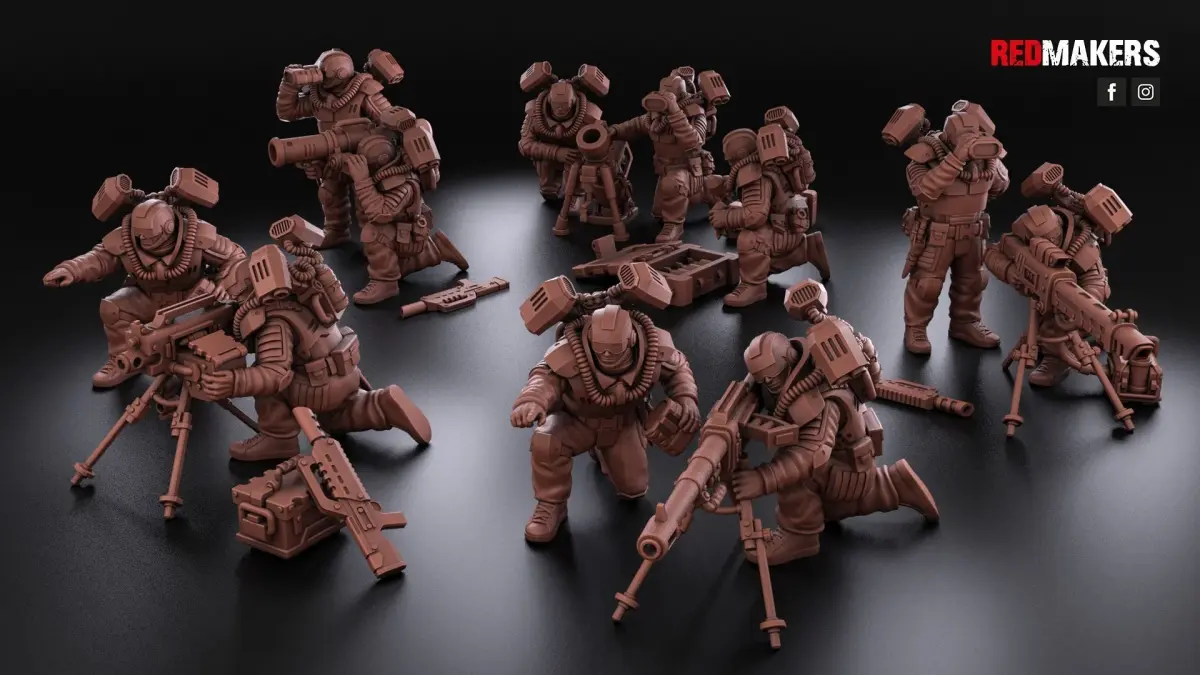 The heavy support squad has five types of heavy weapons. Scaled for 28 mm tabletop.