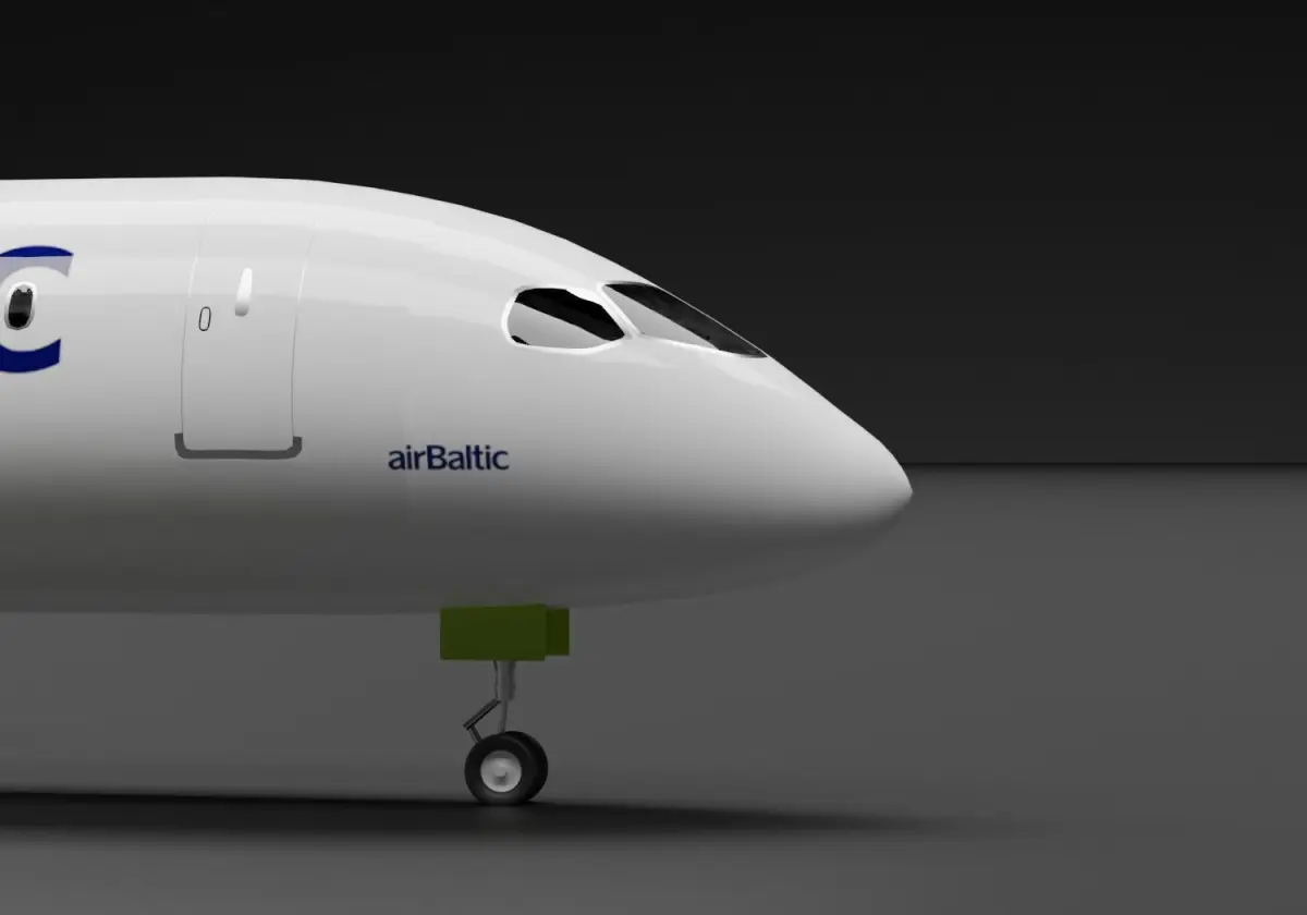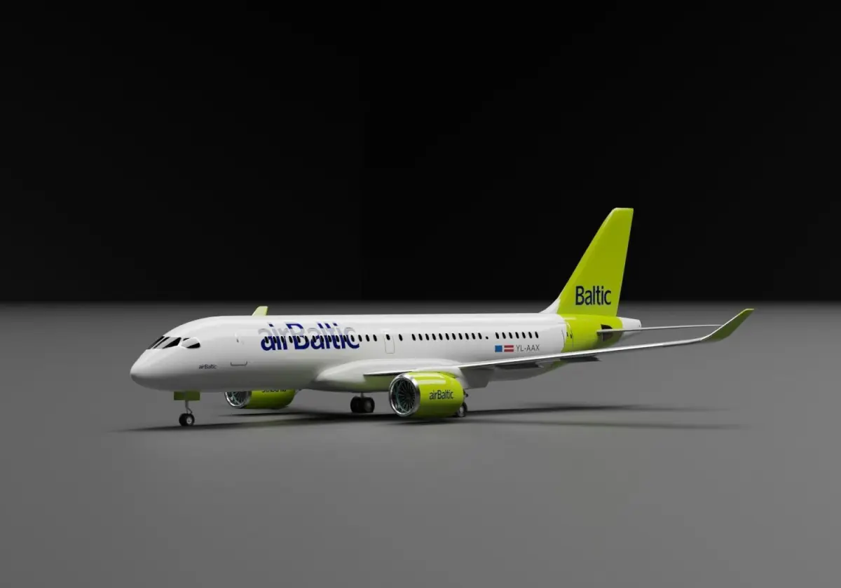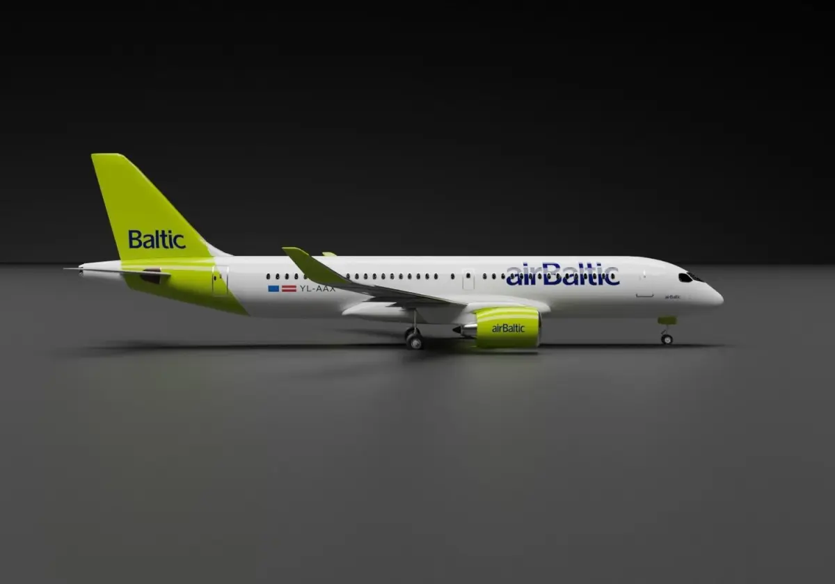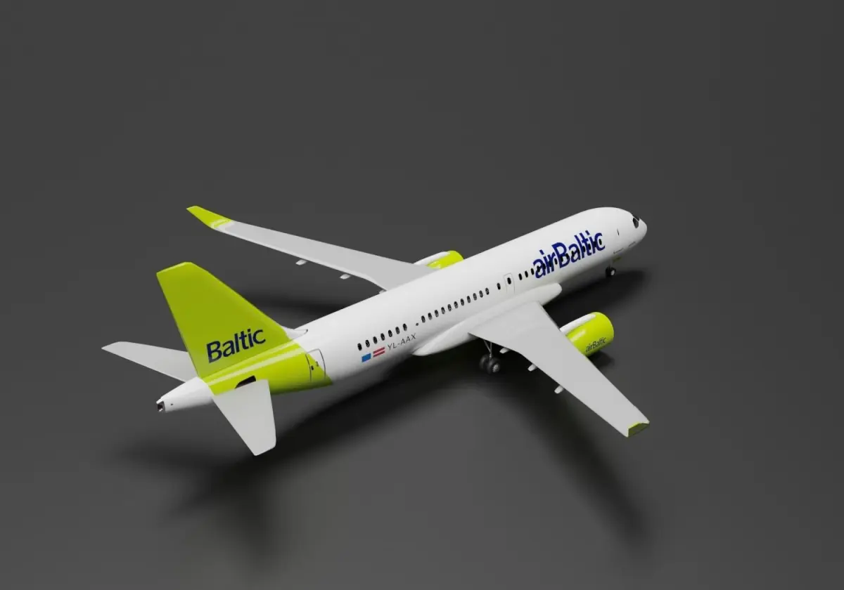 This is a 3d model of an Airbus A220-300 with an Air Baltic livery