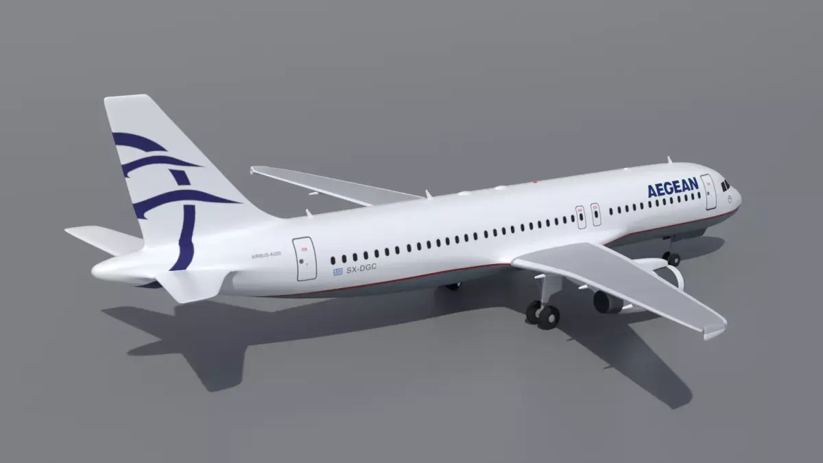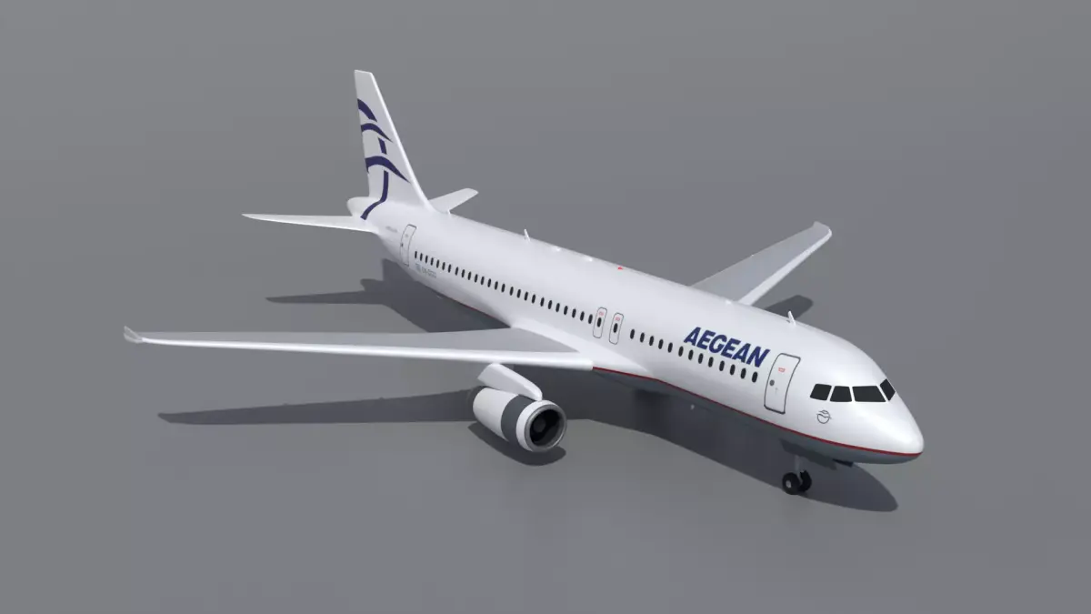 This is a realistic 3D model of a commercial Aegean Airlines airbus a320 airplane jet. The airplane was modeled and prepared for realistic renderings, background, general CG visualization presented as 1 mesh with quads.