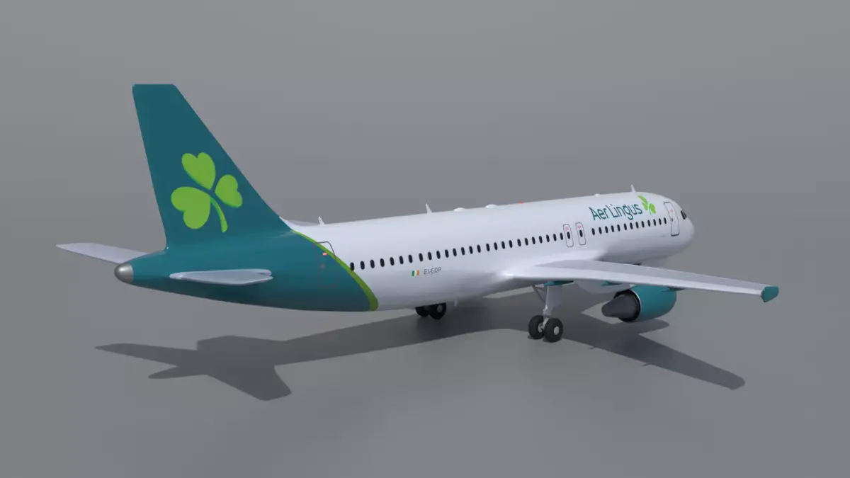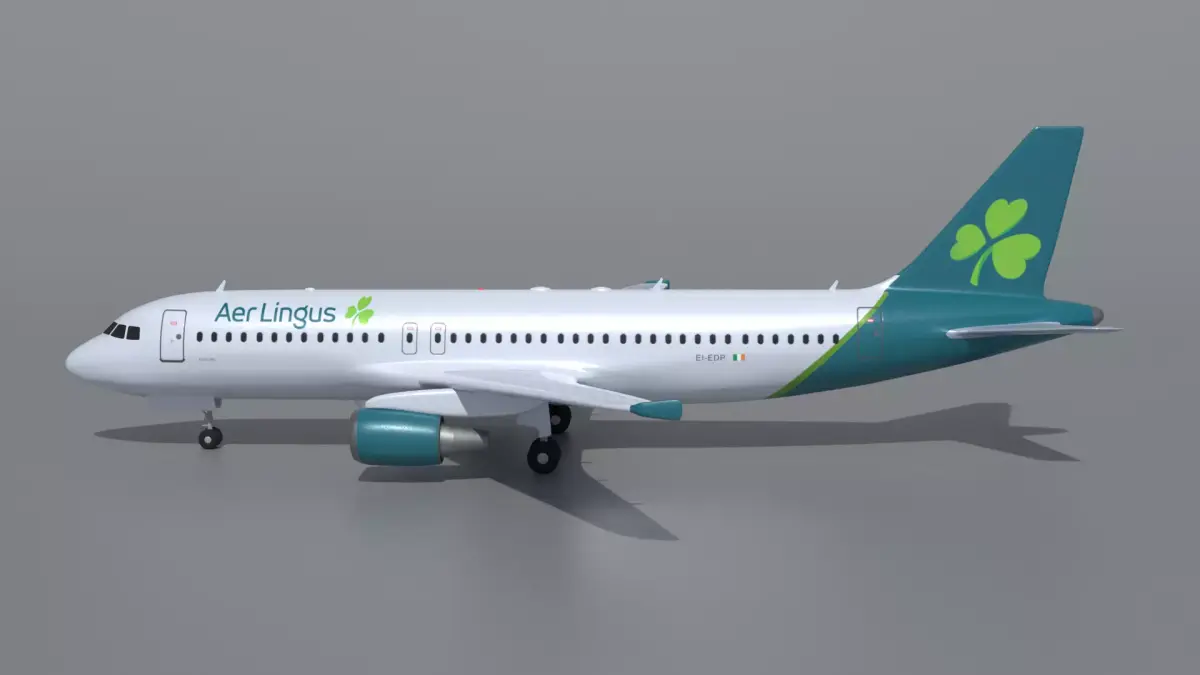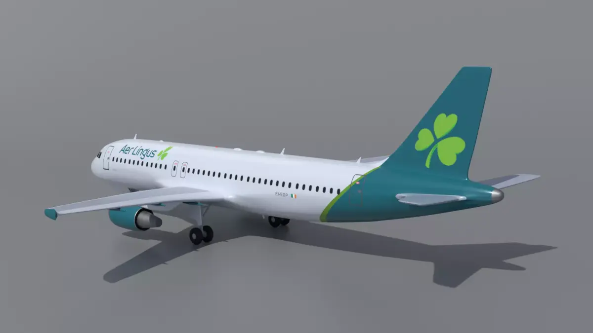 This is a realistic 3D model of a commercial Aer Lingus Airlines airbus a320 airplane jet. The airplane was modeled and prepared for realistic renderings, background, general CG visualization presented as 1 mesh with quads.
