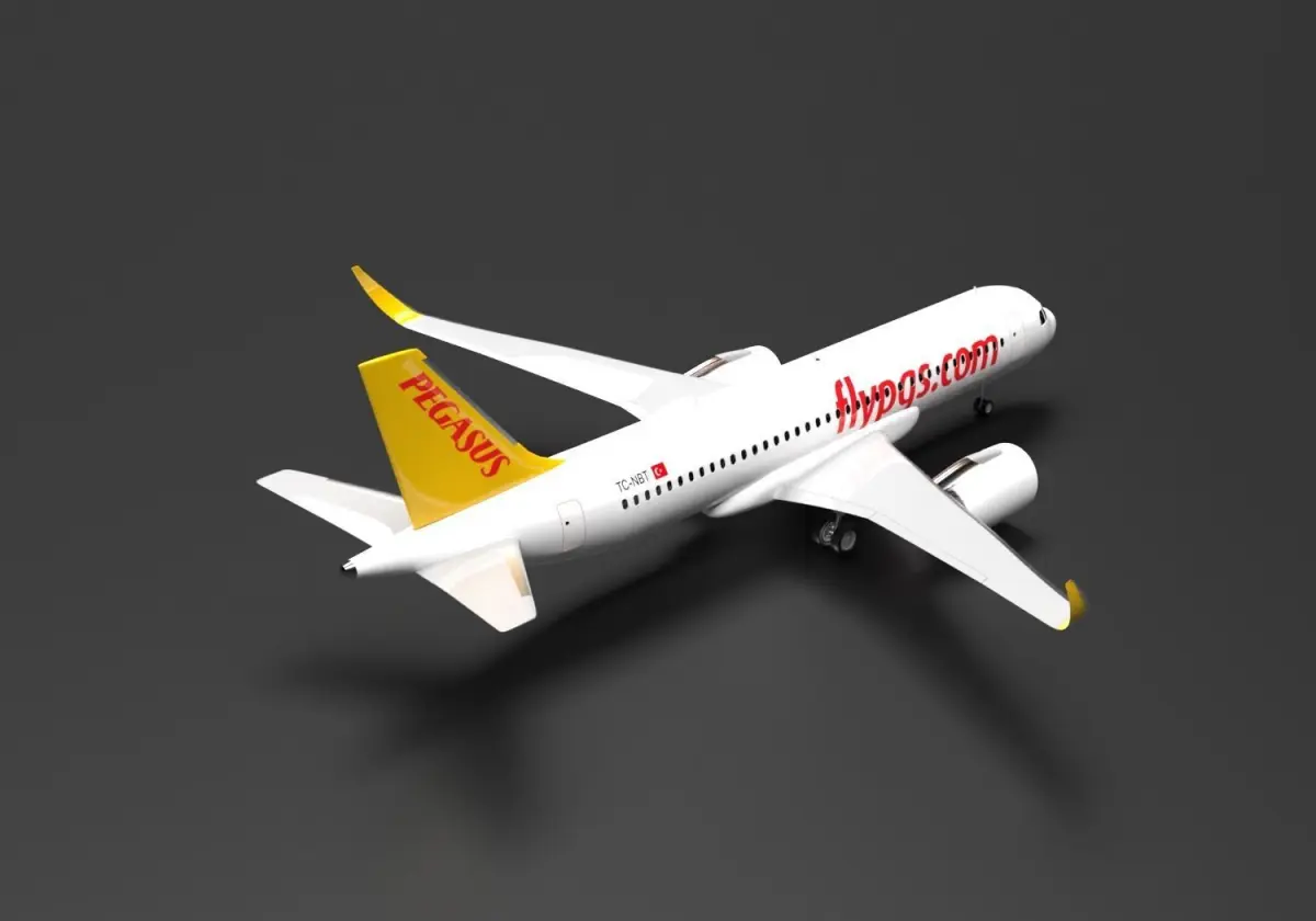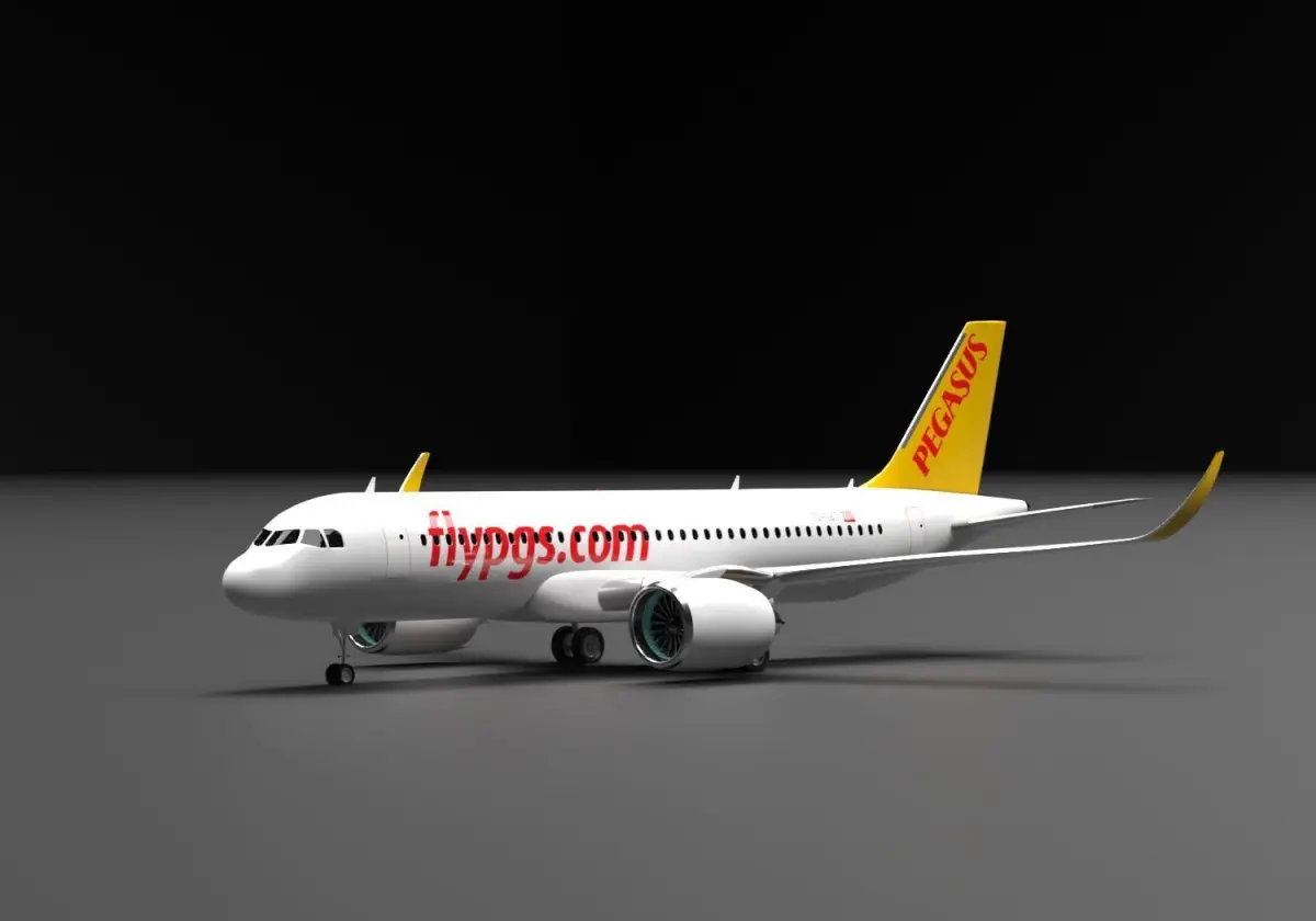 This is a 3d model of an Airbus A320 NEO with a Pegasus livery