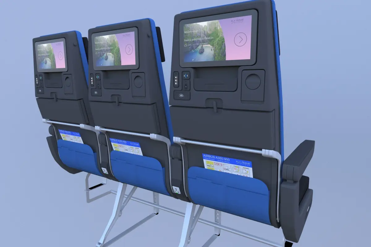 This is a small part of the A350 cabin with RECARO CL3710 seats. It consists of fully modelled sidewall panels with curtains, passenger service units, overhead bins with ceiling panels and good quality seats.