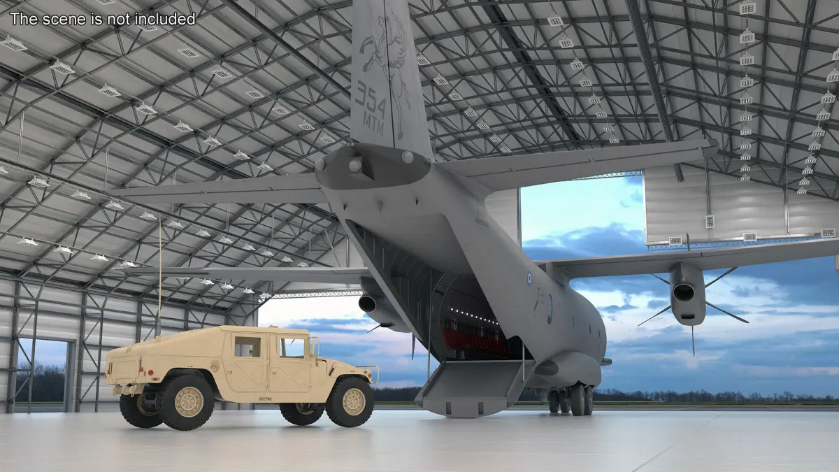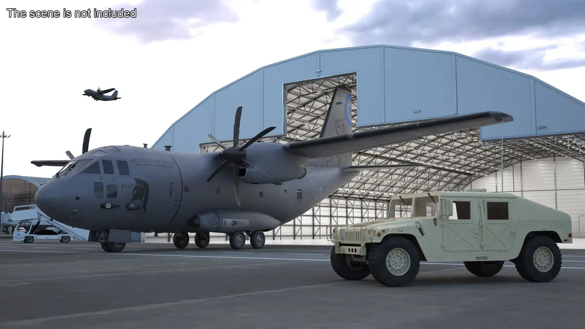 This intricately detailed model features a rigged design, allowing for realistic animation and manipulation. It showcases the distinctive characteristics of the C-27J Spartan, including its twin-engine layout, high-wing configuration, and spacious cargo hold. The model captures essential elements such as the cockpit, landing gear, and Greek military insignia, highlighting its advanced capabilities and robustness for various operational environments.