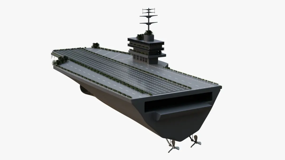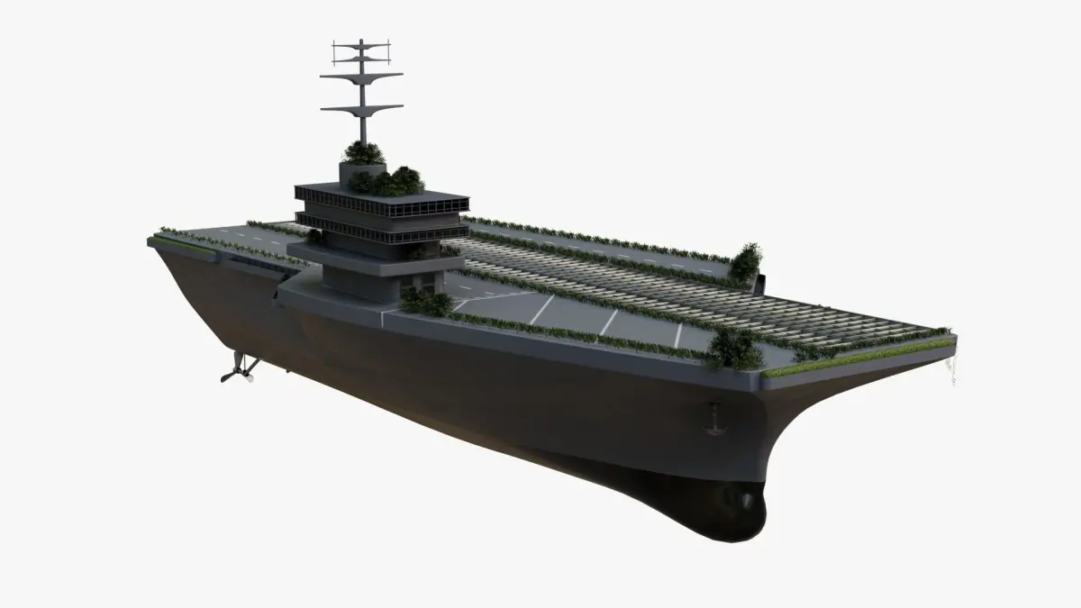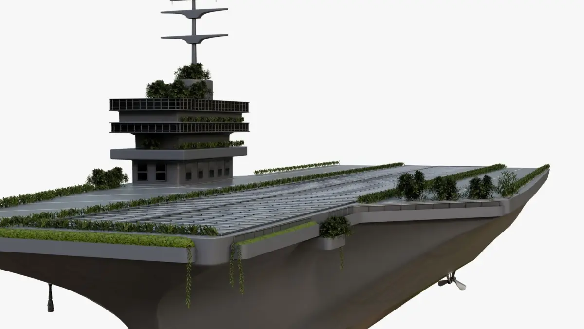 An aircraft carrier transformed into a floating habitat, with green gardens, plants and solar panels covering its deck, hosting peace negotiations and cultural events, while fighter jets stand ready for emergency response missions.