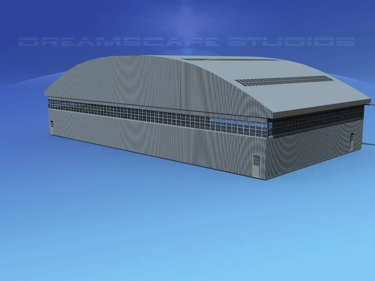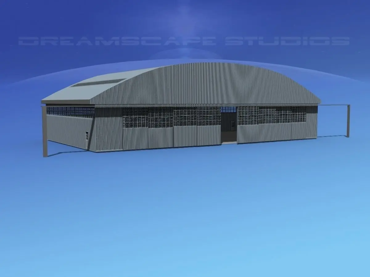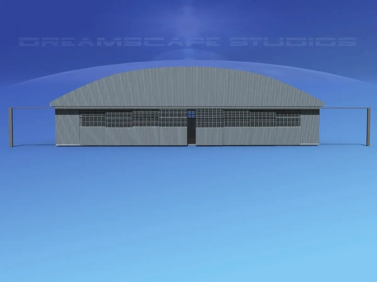 This model is a large military or commercial aircraft hanger. It is fully textured. The model is built very near to scale and includes much of the structural detail for good camera shots. The sliding doors may be animated opening or closing. This hanger is large enough for several fighters, two light or medium WWII era bombers or one of some large heavy bombers. It is also large enough for commercial usage to service aircraft like Lockheed Electra, DC-9, Boeing 727 and others of the same general size. It is not large enough for heavy commercial wide-body aircraft. This model comes with multiple formats and all materials and textures as shown.