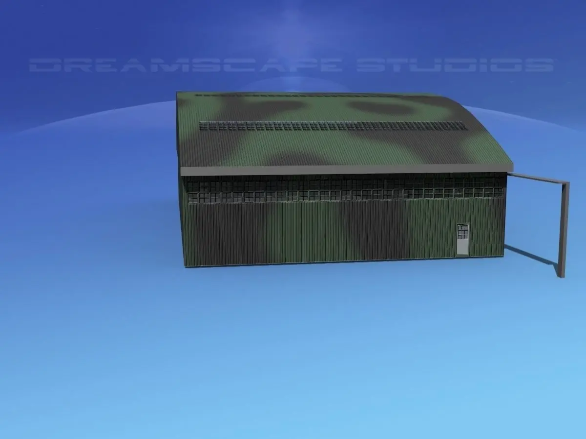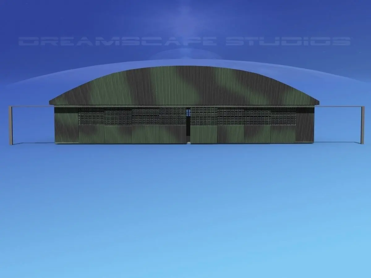 This model is a large military or commercial aircraft storage or maintenance hangar used from the 1930s through the 1970s at many bases including the US. This model has a single sheet materials. The model is built very near to scale in meters. and includes much of the structural detail for good camera shots. The large door panels are animated to open in sequence. Diffuse, bump and opacity maps make up the appearance including the hundreds of window panes and skylights as well as the corrugated surfaced metal.