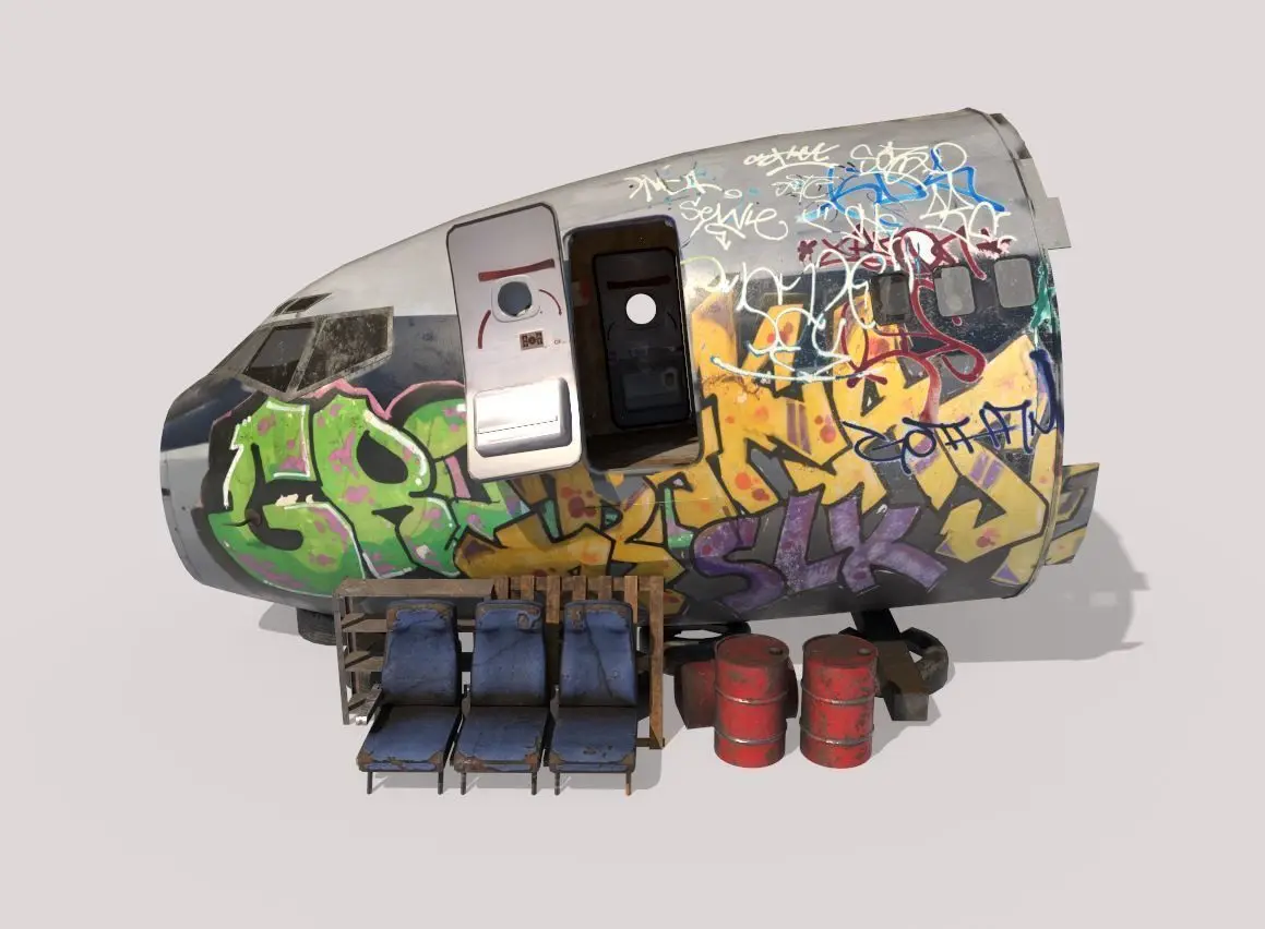 Model of Aircraft Head with Graffiti in the Aircraft Graveyard . Model is very realistic . It has 5 PBR material.Maps are diffuse-specular-glossiness-height and normal. Also, PBR Metallic-Roughness ( Basecolor-Metallic-Normal-Roughness-Height) workflow has been added. Model's textures has two sizes; 4096x4096-2048x2048. All maps are PNG formats.