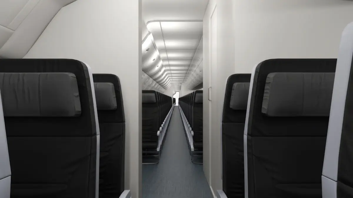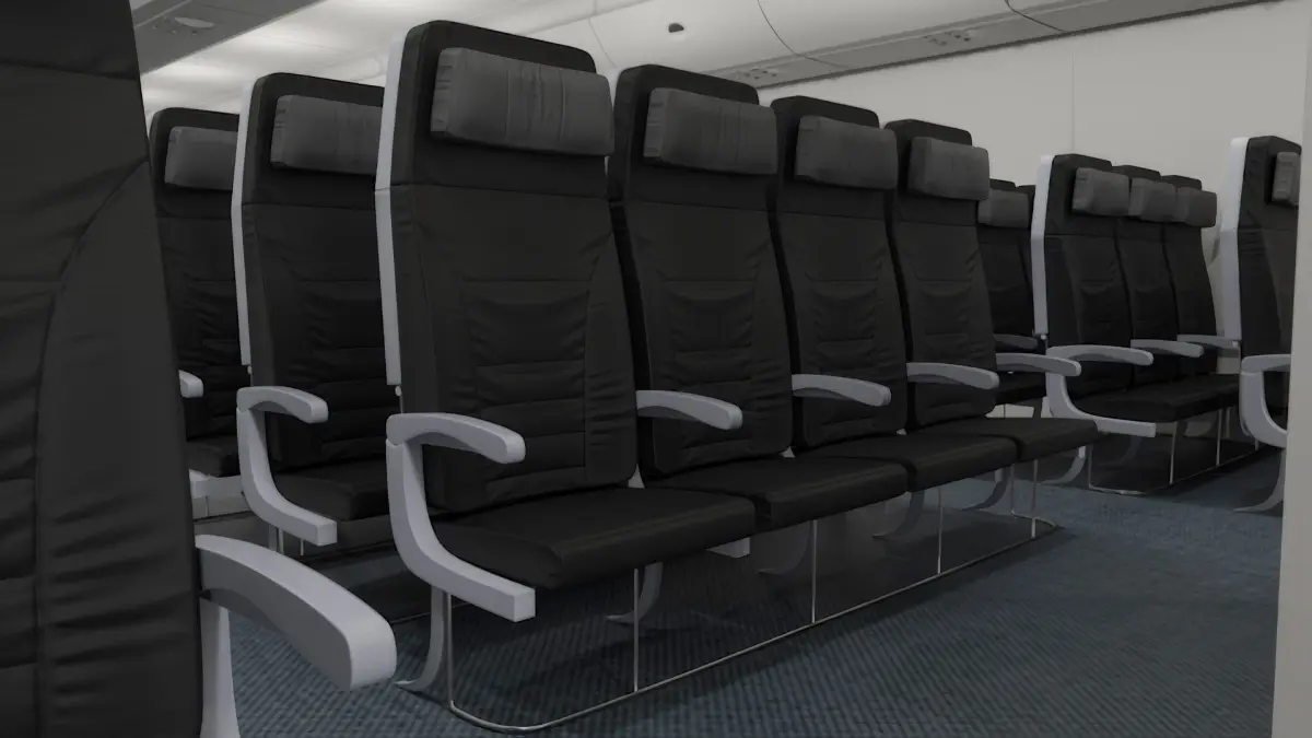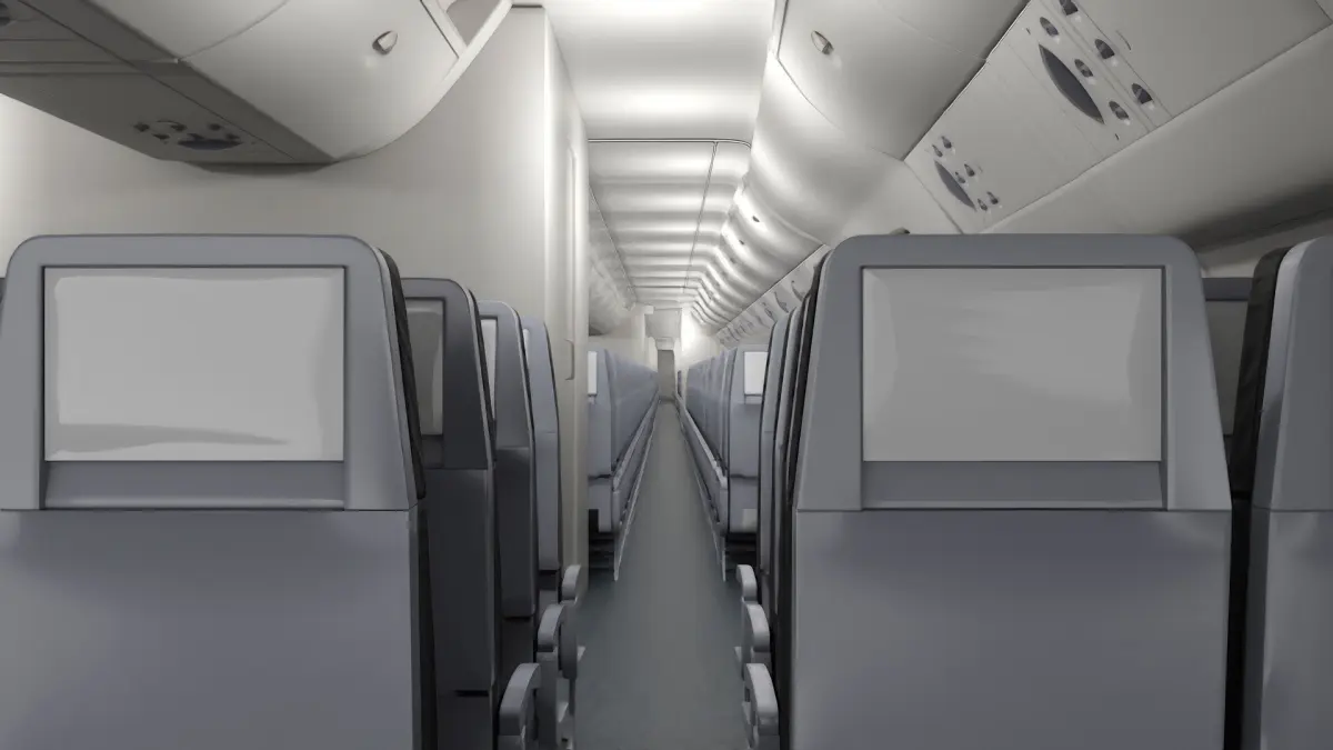 The interior of a civil commercial airliner is designed for passenger comfort and efficiency. Seat rows are typically configured in economy, business, and first classes. Overhead bins store carry-on luggage, while aisles facilitate movement. Lavatories and galleys support onboard services.